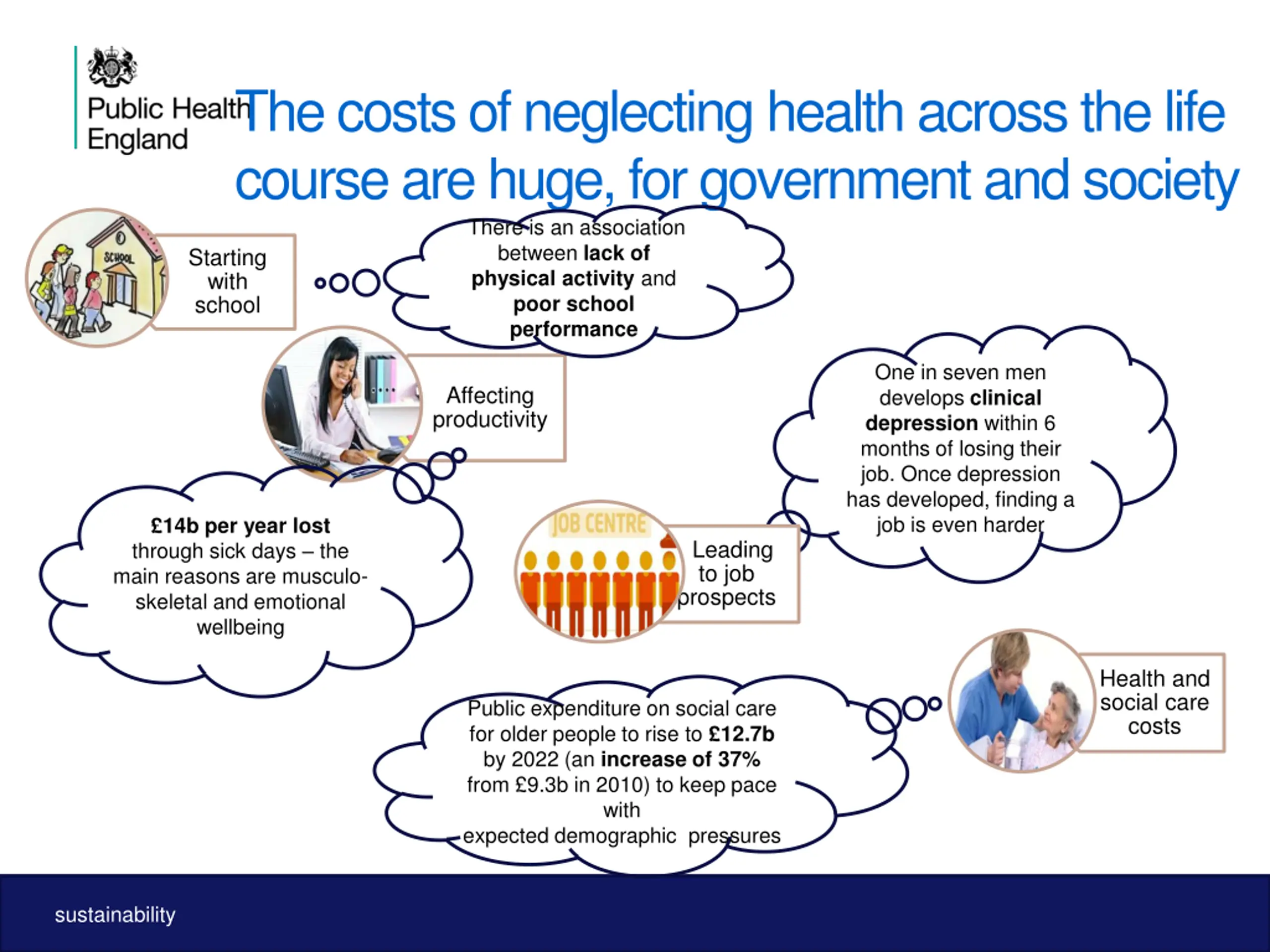 The costs of neglecting health across the life course are huge, for government and society There is an association between lack of physical activity and poor school performance Starting with school One in seven men develops clinical depression within 6 months of losing their job. Once depression has developed, finding a job is even harder Affecting productivity 14b per year lost through sick days the main reasons are musculo- skeletal and emotional wellbeing Leading to job prospects Health and social care costs Public expenditure on social care for older people to rise to 12.7b by 2022 (an increase of 37% from 9.3b in 2010) to keep pace with expected demographic pressures sustainability