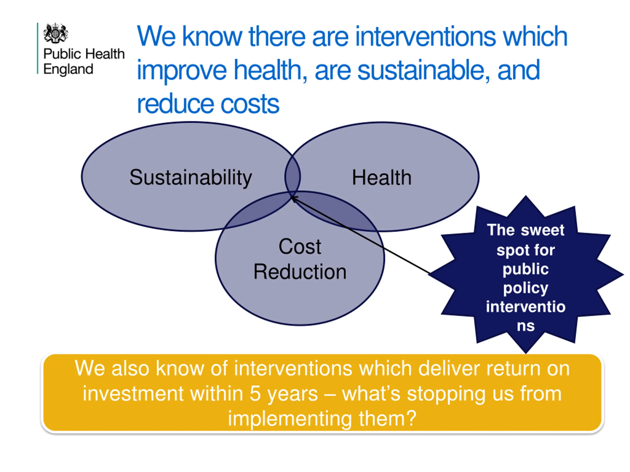 We know there are interventions which improve health, are sustainable, and reduce costs Sustainability Health Thesweet spot for public policy interventio ns Cost Reduction We also know of interventions which deliver return on investment within 5 years what s stopping us from implementing them? sustainability