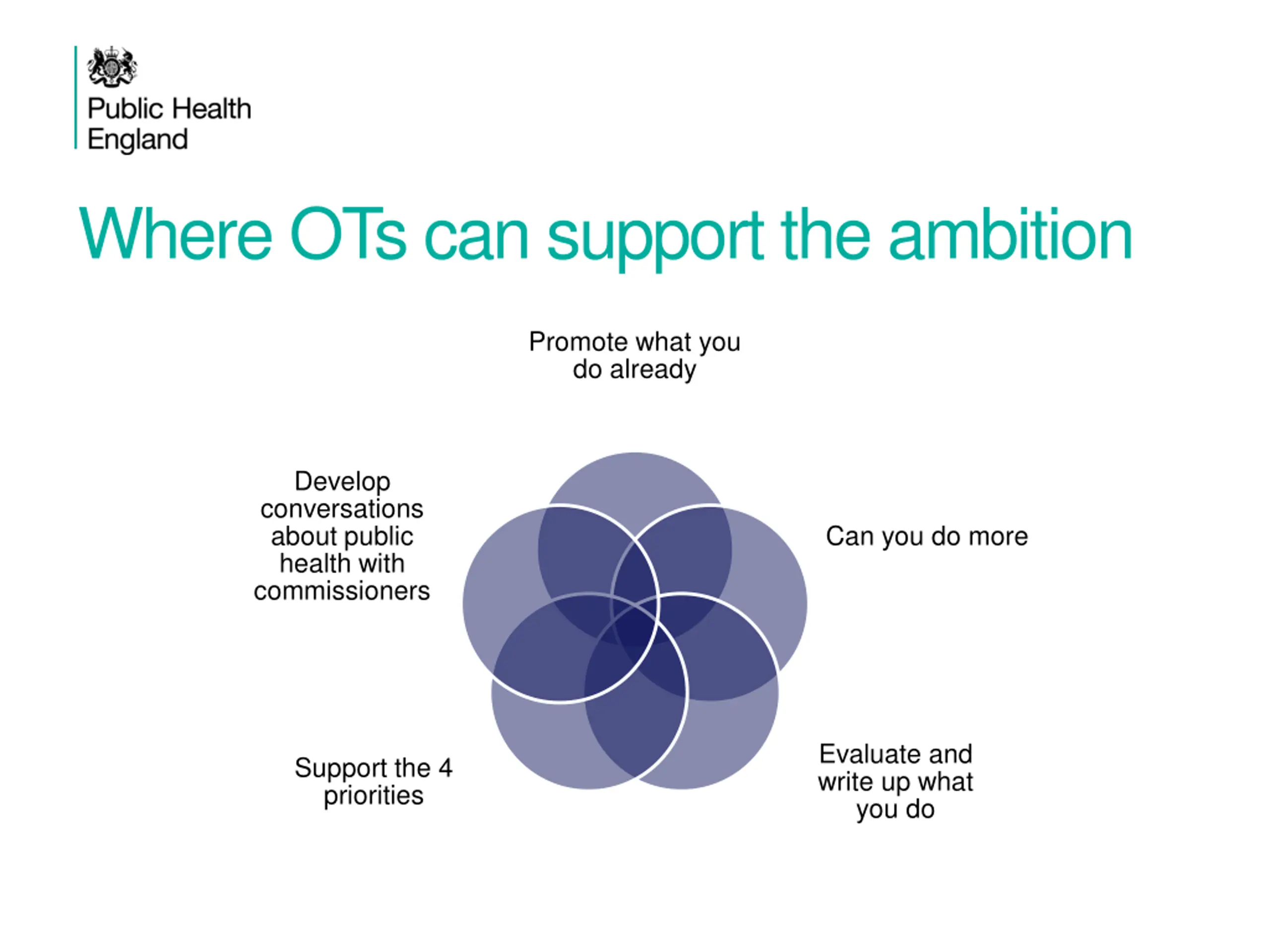 Where OTs can support the ambition Promote what you do already Develop conversations about public health with commissioners Can you do more Evaluate and write up what you do Support the 4 priorities sustainability