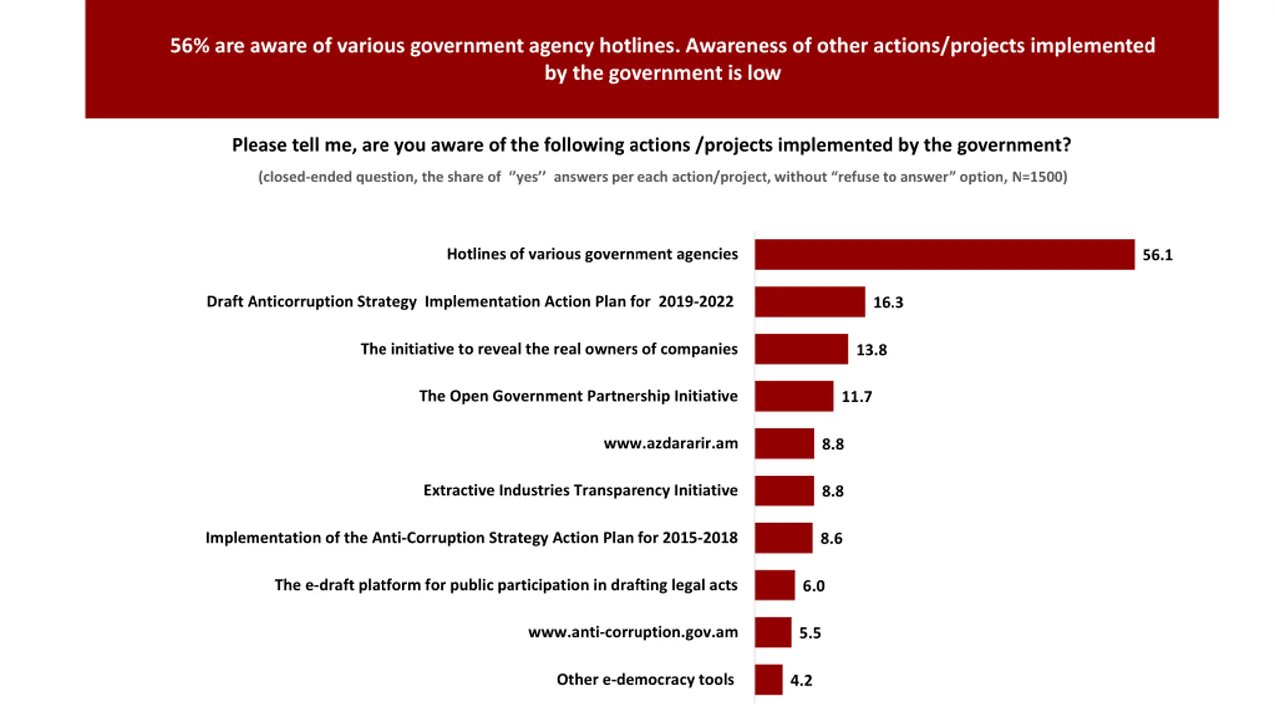 56% are aware of various government agency hotlines. Awareness of other actions/projects implemented by the government is low Please tell me, are you aware of the following actions /projects implemented by the government? (closed-ended question, the share of yes answers per each action/project, without refuse to answer option, N=1500) Hotlines of various government agencies 56.1 Draft Anticorruption Strategy Implementation Action Plan for 2019-2022 16.3 The initiative to reveal the real owners of companies 13.8 The Open Government Partnership Initiative 11.7 www.azdararir.am 8.8 Extractive Industries Transparency Initiative 8.8 Implementation of the Anti-Corruption Strategy Action Plan for 2015-2018 8.6 The e-draft platform for public participation in drafting legal acts 6.0 www.anti-corruption.gov.am 5.5 Other e-democracy tools 4.2