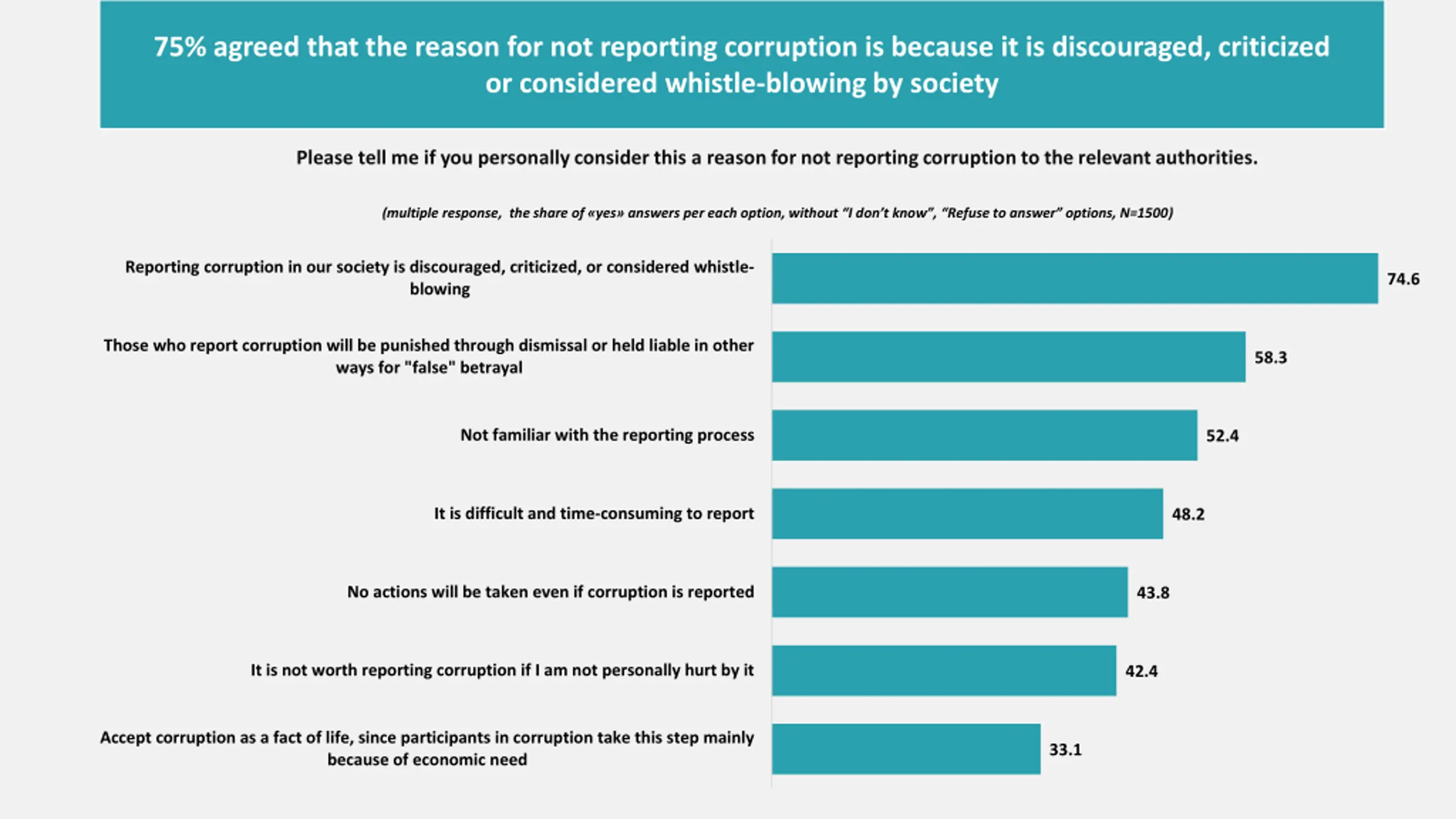 75% agreed that the reason for not reporting corruption is because it is discouraged, criticized or considered whistle-blowing by society Please tell me if you personally consider this a reason for not reporting corruption to the relevant authorities. (multiple response, the share of yes answers per each option, without I don t know , Refuse to answer options, N=1500) Reporting corruption in our society is discouraged, criticized, or considered whistle- blowing 74.6 Those who report corruption will be punished through dismissal or held liable in other ways for "false" betrayal 58.3 Not familiar with the reporting process 52.4 It is difficult and time-consuming to report 48.2 No actions will be taken even if corruption is reported 43.8 It is not worth reporting corruption if I am not personally hurt by it 42.4 Accept corruption as a fact of life, since participants in corruption take this step mainly because of economic need 33.1