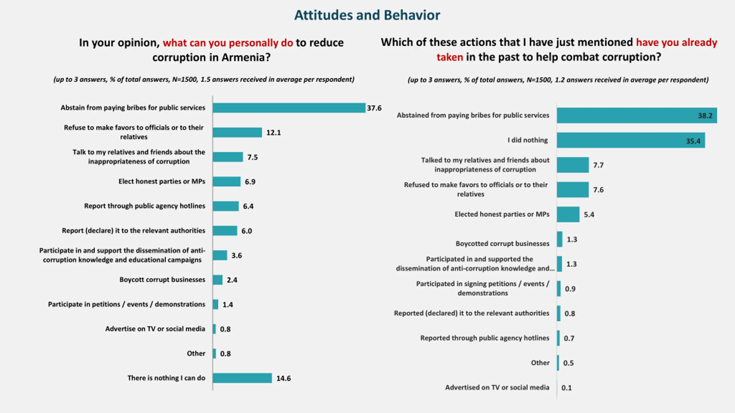Attitudes and Behavior Which of these actions that I have just mentioned have you already taken in the past to help combat corruption? In your opinion, what can you personally do to reduce corruption in Armenia? (up to 3 answers, % of total answers, N=1500, 1.5 answers received in average per respondent) (up to 3 answers, % of total answers, N=1500, 1.2 answers received in average per respondent) Abstain from paying bribes for public services 37.6 Abstained from paying bribes for public services 38.2 Refuse to make favors to officials or to their relatives 12.1 I did nothing 35.4 Talk to my relatives and friends about the inappropriateness of corruption 7.5 Talked to my relatives and friends about inappropriateness of corruption 7.7 Elect honest parties or MPs 6.9 Refused to make favors to officials or to their relatives 7.6 Report through public agency hotlines 6.4 Elected honest parties or MPs 5.4 Report (declare) it to the relevant authorities 6.0 1.3 Boycotted corrupt businesses Participate in and support the dissemination of anti- corruption knowledge and educational campaigns 3.6 Participated in and supported the dissemination of anti-corruption knowledge and 1.3 Boycott corrupt businesses 2.4 Participated in signing petitions / events / demonstrations 0.9 Participate in petitions / events / demonstrations 1.4 Reported (declared) it to the relevant authorities 0.8 Advertise on TV or social media 0.8 Reported through public agency hotlines 0.7 Other 0.8 Other 0.5 There is nothing I can do 14.6 Advertised on TV or social media 0.1