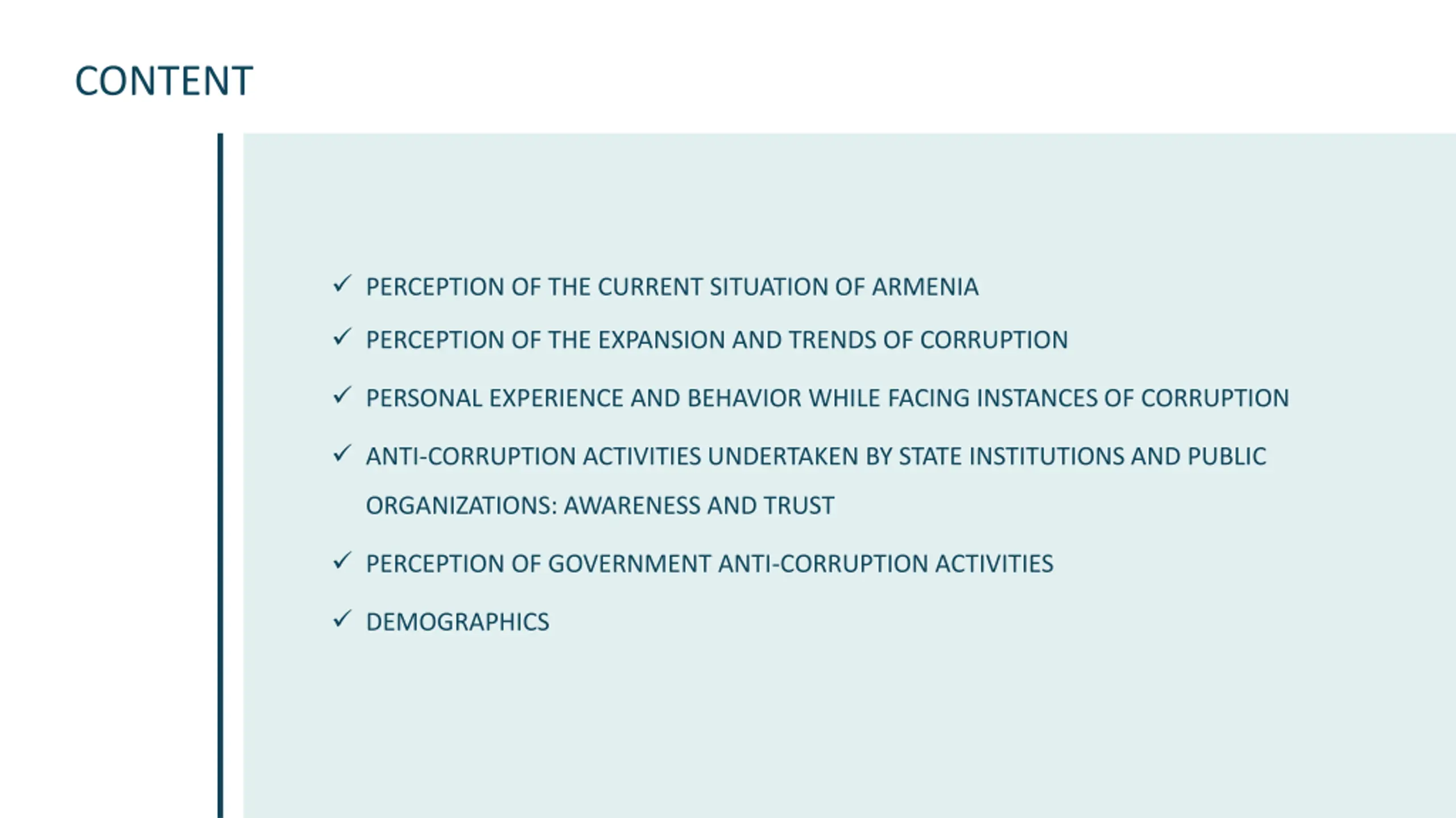 CONTENT PERCEPTION OF THE CURRENT SITUATION OF ARMENIA PERCEPTION OF THE EXPANSION AND TRENDS OF CORRUPTION PERSONAL EXPERIENCE AND BEHAVIOR WHILE FACING INSTANCES OF CORRUPTION ANTI-CORRUPTION ACTIVITIES UNDERTAKEN BY STATE INSTITUTIONS AND PUBLIC ORGANIZATIONS: AWARENESS AND TRUST PERCEPTION OF GOVERNMENT ANTI-CORRUPTION ACTIVITIES DEMOGRAPHICS