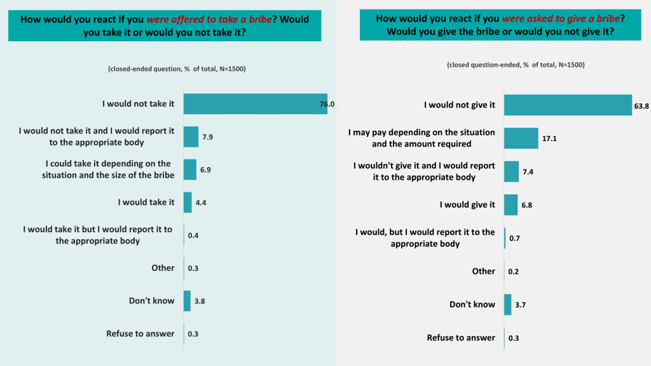 How would you react if you were asked to give a bribe? Would you give the bribe or would you not give it? How would you react if you were offered to take a bribe? Would you take it or would you not take it? (closed question-ended, % of total, N=1500) (closed-ended question, % of total, N=1500) I would not take it 76.0 I would not give it 63.8 I would not take it and I would report it to the appropriate body I may pay depending on the situation and the amount required 7.9 17.1 I could take it depending on the situation and the size of the bribe I wouldn't give it and I would report it to the appropriate body 6.9 7.4 I would take it 4.4 I would give it 6.8 I would take it but I would report it to the appropriate body I would, but I would report it to the appropriate body 0.4 0.7 Other 0.3 Other 0.2 Don't know 3.8 Don't know 3.7 Refuse to answer 0.3 Refuse to answer 0.3