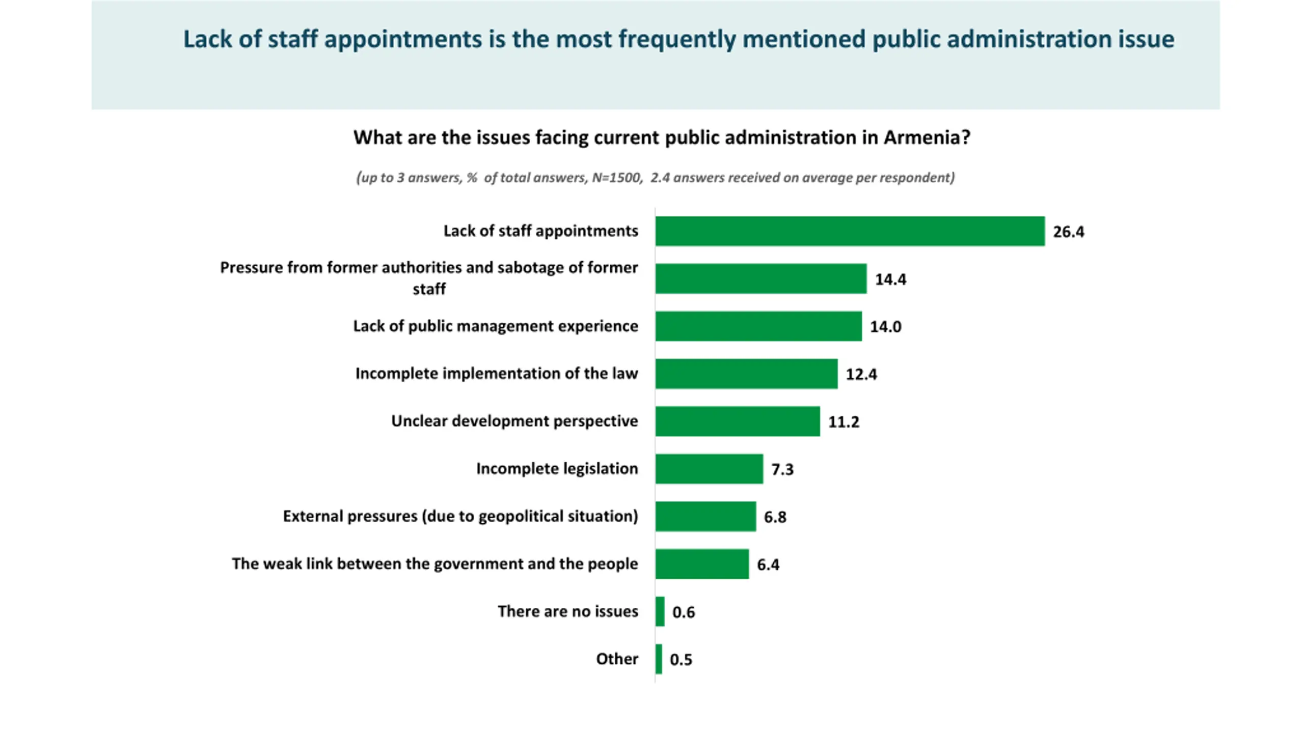 Lack of staff appointments is the most frequently mentioned public administration issue What are the issues facing current public administration in Armenia? (up to 3 answers, % of total answers, N=1500, 2.4 answers received on average per respondent) Lack of staff appointments 26.4 Pressure from former authorities and sabotage of former staff 14.4 Lack of public management experience 14.0 Incomplete implementation of the law 12.4 Unclear development perspective 11.2 Incomplete legislation 7.3 External pressures (due to geopolitical situation) 6.8 The weak link between the government and the people 6.4 There are no issues 0.6 Other 0.5