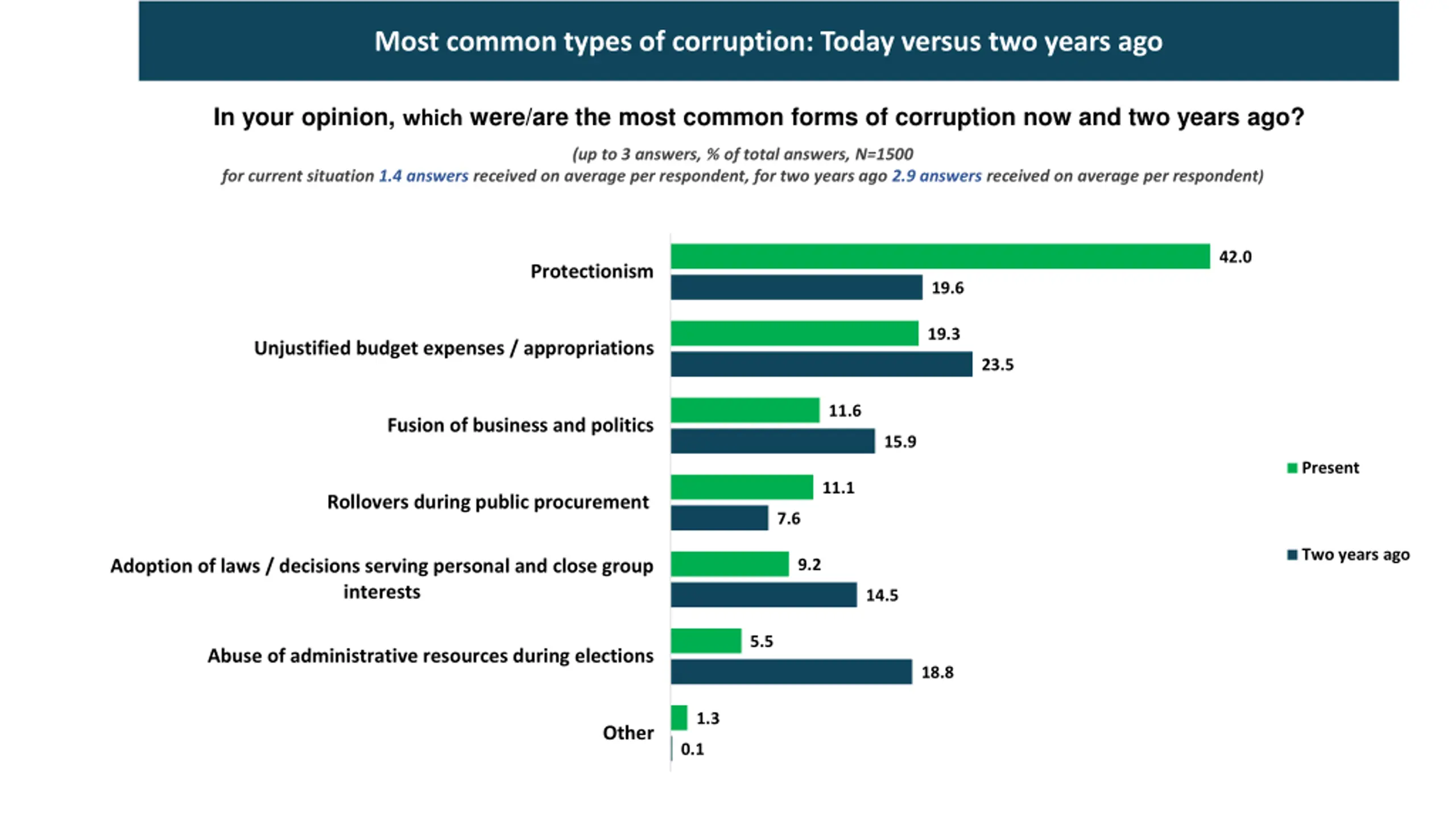 Most common types of corruption: Today versus two years ago In your opinion, which were/are the most common forms of corruption now and two years ago? (up to 3 answers, % of total answers, N=1500 for current situation 1.4 answers received on average per respondent, for two years ago 2.9 answers received on average per respondent) 42.0 Protectionism 19.6 19.3 Unjustified budget expenses / appropriations 23.5 11.6 Fusion of business and politics 15.9 Present 11.1 Rollovers during public procurement 7.6 Two years ago 9.2 Adoption of laws / decisions serving personal and close group interests 14.5 5.5 Abuse of administrative resources during elections 18.8 1.3 Other 0.1