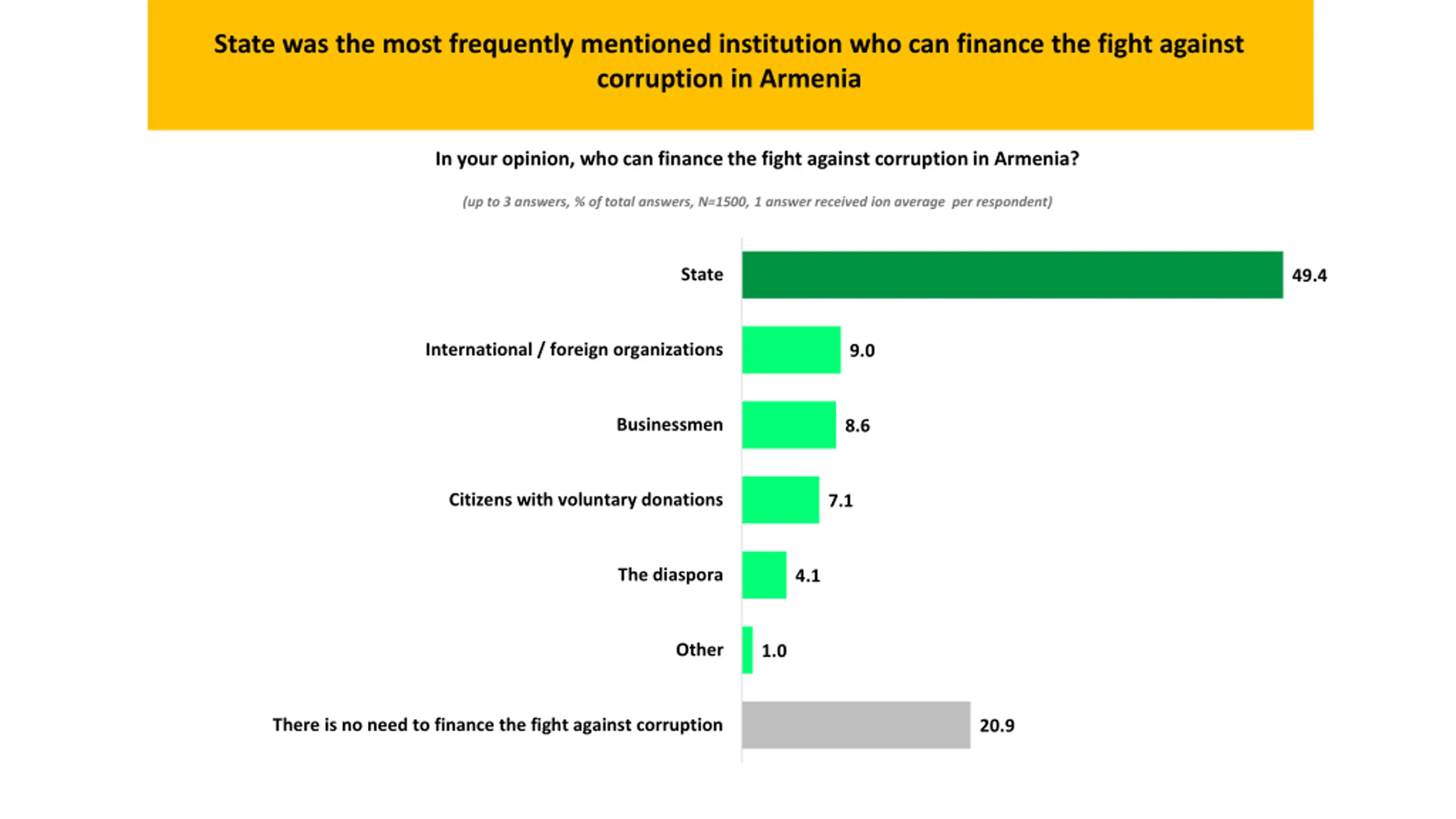 State was the most frequently mentioned institution who can finance the fight against corruption in Armenia In your opinion, who can finance the fight against corruption in Armenia? (up to 3 answers, % of total answers, N=1500, 1 answer received ion average per respondent) State 49.4 International / foreign organizations 9.0 Businessmen 8.6 Citizens with voluntary donations 7.1 The diaspora 4.1 Other 1.0 There is no need to finance the fight against corruption 20.9
