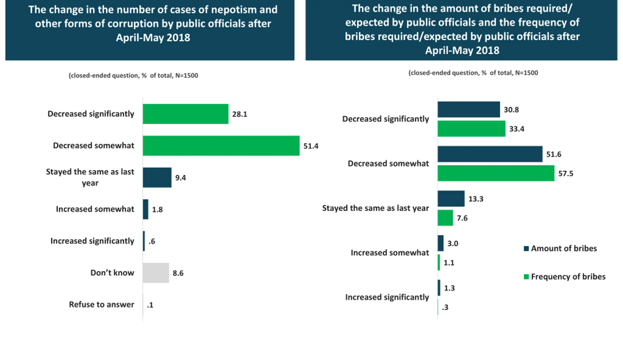 The change in the amount of bribes required/ expected by public officials and the frequency of bribes required/expected by public officials after April-May 2018 The change in the number of cases of nepotism and other forms of corruption by public officials after April-May 2018 (closed-ended question, % of total, N=1500 (closed-ended question, % of total, N=1500 30.8 Decreased significantly 28.1 Decreased significantly 33.4 Decreased somewhat 51.4 51.6 Decreased somewhat Stayed the same as last year 57.5 9.4 13.3 Stayed the same as last year Increased somewhat 1.8 7.6 Increased significantly .6 3.0 Amount of bribes Increased somewhat 1.1 Don t know 8.6 Frequency of bribes 1.3 Increased significantly Refuse to answer .1 .3