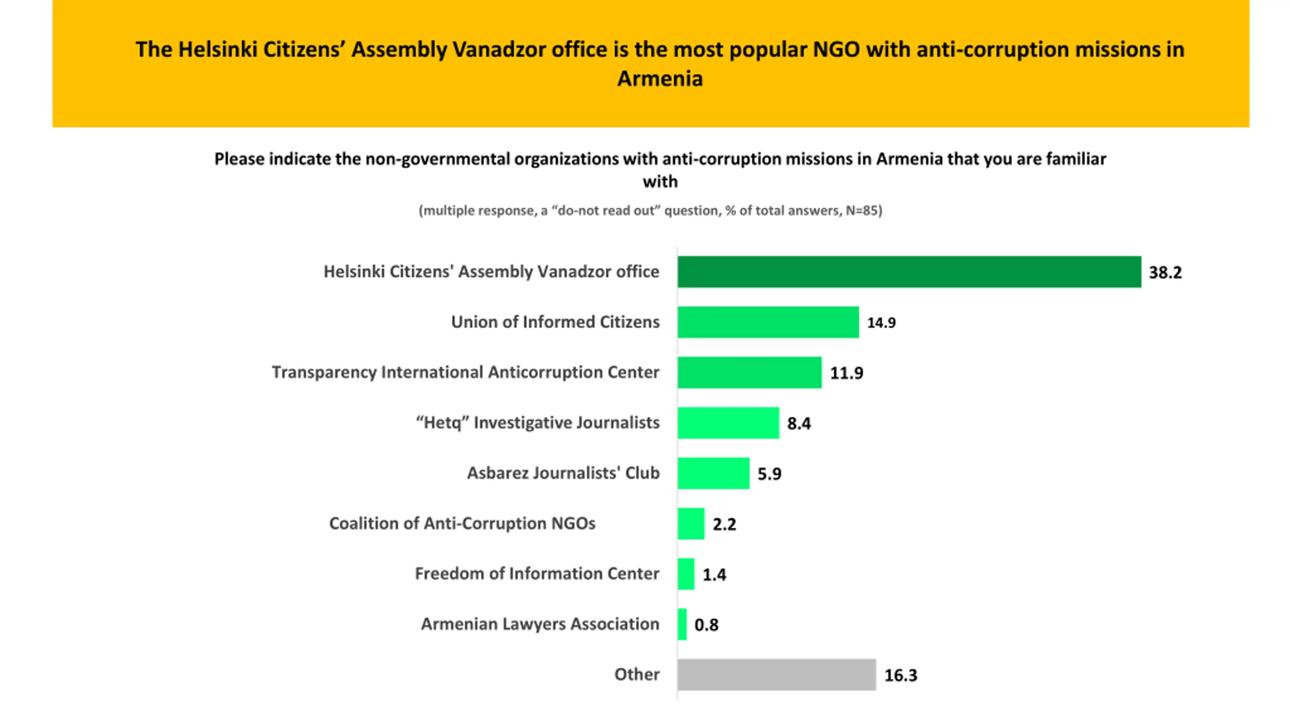 The Helsinki Citizens Assembly Vanadzor office is the most popular NGO with anti-corruption missions in Armenia Please indicate the non-governmental organizations with anti-corruption missions in Armenia that you are familiar with (multiple response, a do-not read out question, % of total answers, N=85) Helsinki Citizens' Assembly Vanadzor office 38.2 Union of Informed Citizens 14.9 Transparency International Anticorruption Center 11.9 Hetq Investigative Journalists 8.4 Asbarez Journalists' Club 5.9 Coalition of Anti-Corruption NGOs 2.2 Freedom of Information Center 1.4 Armenian Lawyers Association 0.8 Other 16.3