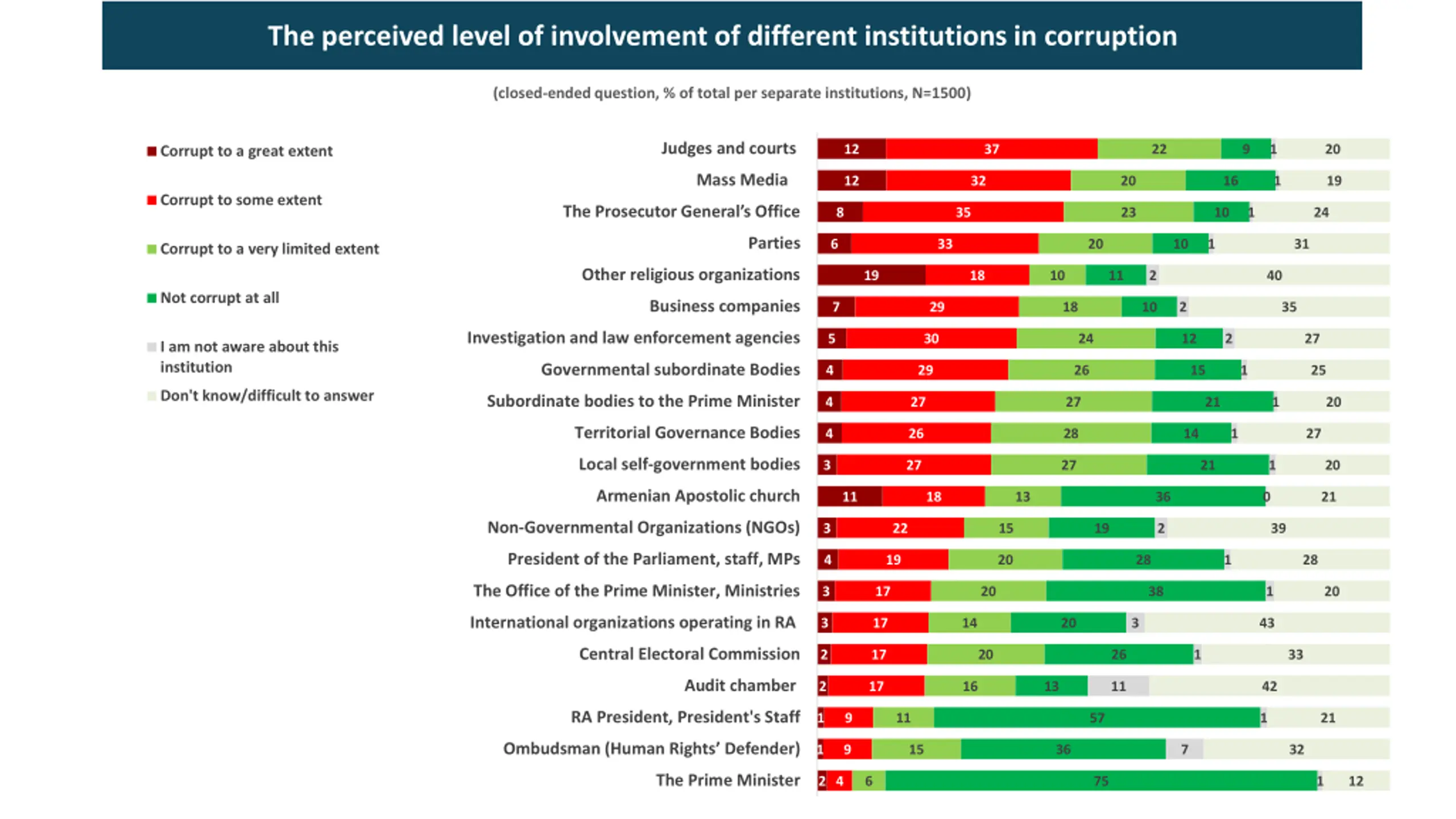 The perceived level of involvement of different institutions in corruption (closed-ended question, % of total per separate institutions, N=1500) Judges and courts 12 37 22 9 1 20 Corrupt to a great extent Mass Media 12 32 20 16 1 19 Corrupt to some extent The Prosecutor General s Office 8 35 23 10 1 24 Parties 6 33 20 10 1 31 Corrupt to a very limited extent Other religious organizations 19 18 10 11 2 40 Not corrupt at all Business companies 7 29 18 10 2 35 Investigation and law enforcement agencies 5 30 24 12 2 27 I am not aware about this institution Governmental subordinate Bodies 4 29 26 15 1 25 Don't know/difficult to answer Subordinate bodies to the Prime Minister 4 27 27 21 1 20 Territorial Governance Bodies 4 26 28 14 1 27 Local self-government bodies 3 27 27 21 1 20 Armenian Apostolic church 11 18 13 36 0 21 Non-Governmental Organizations (NGOs) 3 22 15 19 2 39 President of the Parliament, staff, MPs 4 19 20 28 1 28 The Office of the Prime Minister, Ministries 3 17 20 38 1 20 International organizations operating in RA 3 17 14 20 3 43 Central Electoral Commission 2 17 20 26 1 33 Audit chamber 2 17 16 13 11 42 RA President, President's Staff 1 9 11 57 1 21 Ombudsman (Human Rights Defender) 1 9 15 36 7 32 The Prime Minister 2 4 6 75 1 12
