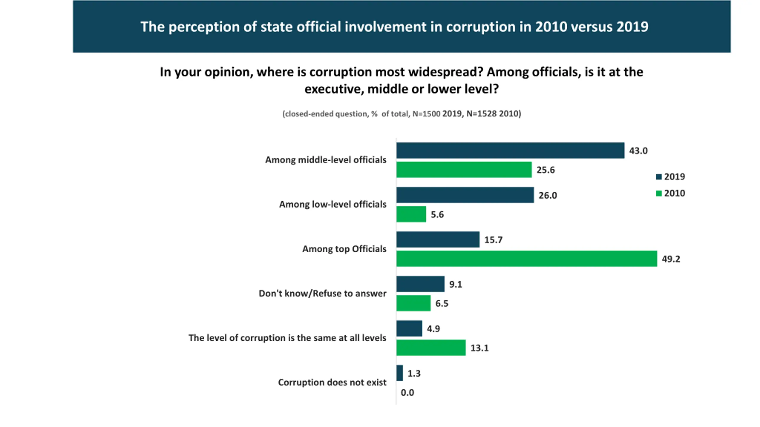 The perception of state official involvement in corruption in 2010 versus 2019 In your opinion, where is corruption most widespread? Among officials, is it at the executive, middle or lower level? (closed-ended question, % of total, N=1500 2019, N=1528 2010) 43.0 Among middle-level officials 25.6 2019 2010 26.0 Among low-level officials 5.6 15.7 Among top Officials 49.2 9.1 Don't know/Refuse to answer 6.5 4.9 The level of corruption is the same at all levels 13.1 1.3 Corruption does not exist 0.0