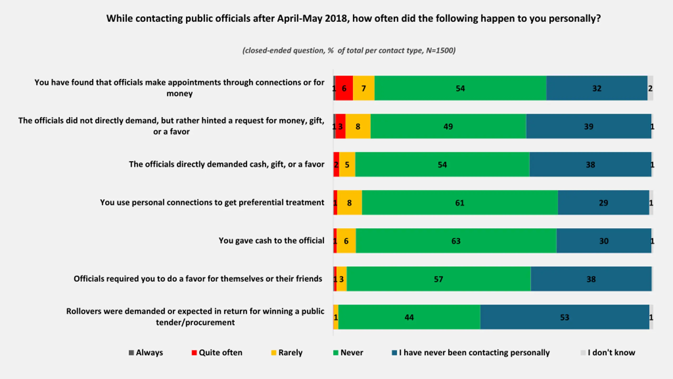 While contacting public officials after April-May 2018, how often did the following happen to you personally? (closed-ended question, % of total per contact type, N=1500) You have found that officials make appointments through connections or for money 1 6 7 54 32 2 The officials did not directly demand, but rather hinted a request for money, gift, or a favor 1 3 8 49 39 1 The officials directly demanded cash, gift, or a favor 2 5 54 38 1 You use personal connections to get preferential treatment 1 8 61 29 1 You gave cash to the official 1 6 63 30 1 Officials required you to do a favor for themselves or their friends 1 3 57 38 Rollovers were demanded or expected in return for winning a public tender/procurement 1 44 53 1 Always Quite often Rarely Never I have never been contacting personally I don't know