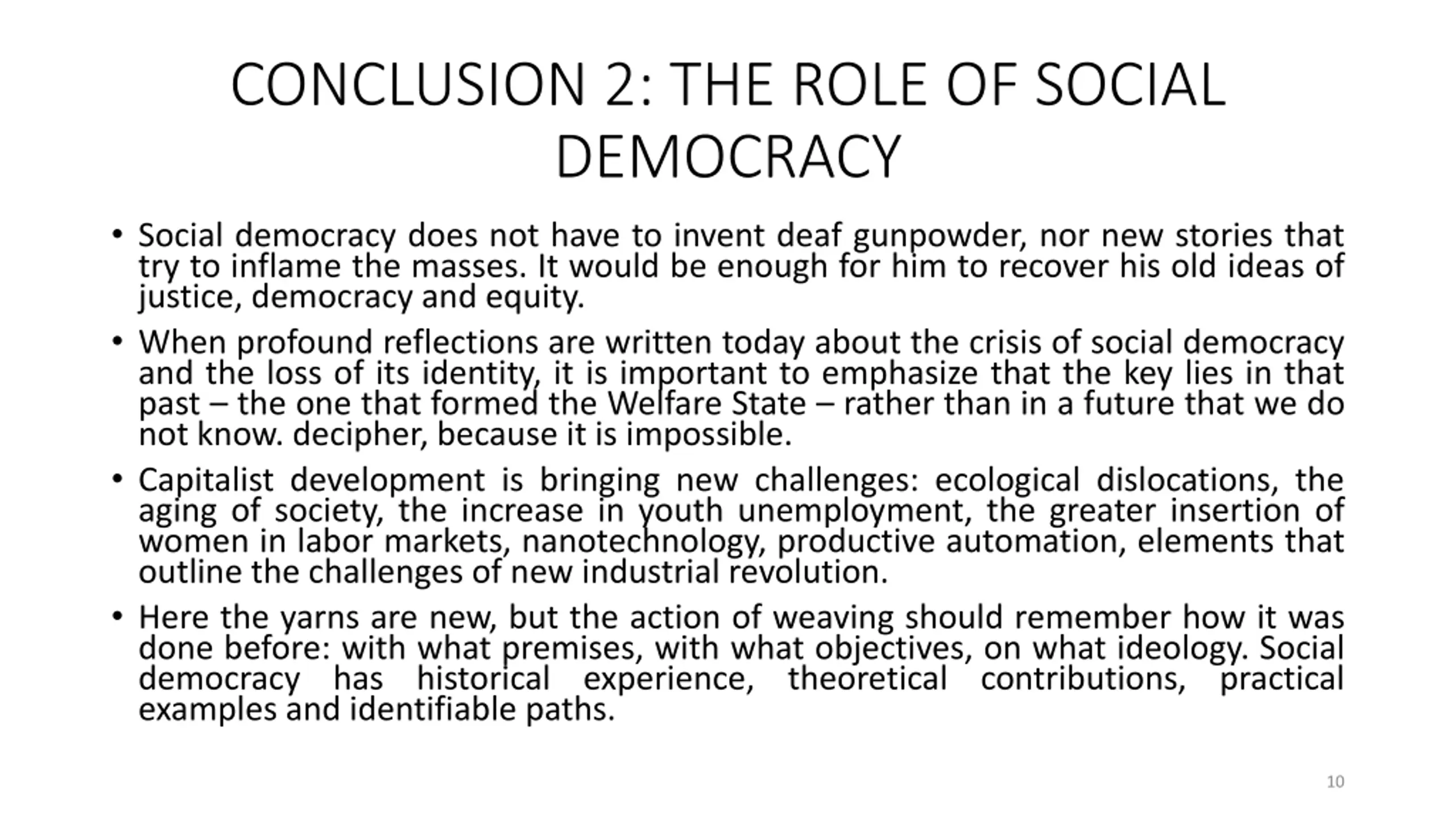 CONCLUSION 2: THE ROLE OF SOCIAL DEMOCRACY Social democracy does not have to invent deaf gunpowder, nor new stories that try to inflame the masses. It would be enough for him to recover his old ideas of justice, democracy and equity. When profound reflections are written today about the crisis of social democracy and the loss of its identity, it is important to emphasize that the key lies in that past the one that formed the Welfare State rather than in a future that we do not know. decipher, because it is impossible. Capitalist development is bringing new challenges: ecological dislocations, the aging of society, the increase in youth unemployment, the greater insertion of women in labor markets, nanotechnology, productive automation, elements that outline the challenges of new industrial revolution. Here the yarns are new, but the action of weaving should remember how it was done before: with what premises, with what objectives, on what ideology. Social democracy has historical experience, theoretical contributions, practical examples and identifiable paths. 10