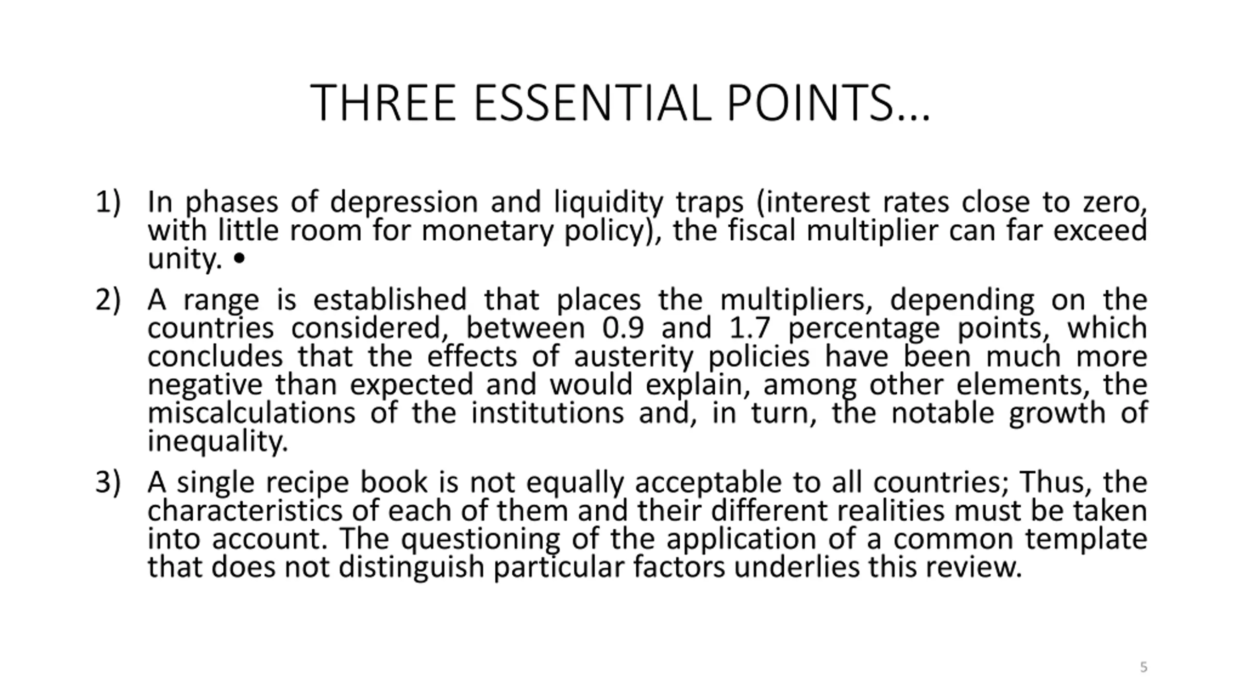 THREE ESSENTIAL POINTS 1) In phases of depression and liquidity traps (interest rates close to zero, with little room for monetary policy), the fiscal multiplier can far exceed unity. 2) A range is established that places the multipliers, depending on the countries considered, between 0.9 and 1.7 percentage points, which concludes that the effects of austerity policies have been much more negative than expected and would explain, among other elements, the miscalculations of the institutions and, in turn, the notable growth of inequality. 3) A single recipe book is not equally acceptable to all countries; Thus, the characteristics of each of them and their different realities must be taken into account. The questioning of the application of a common template that does not distinguish particular factors underlies this review. 5