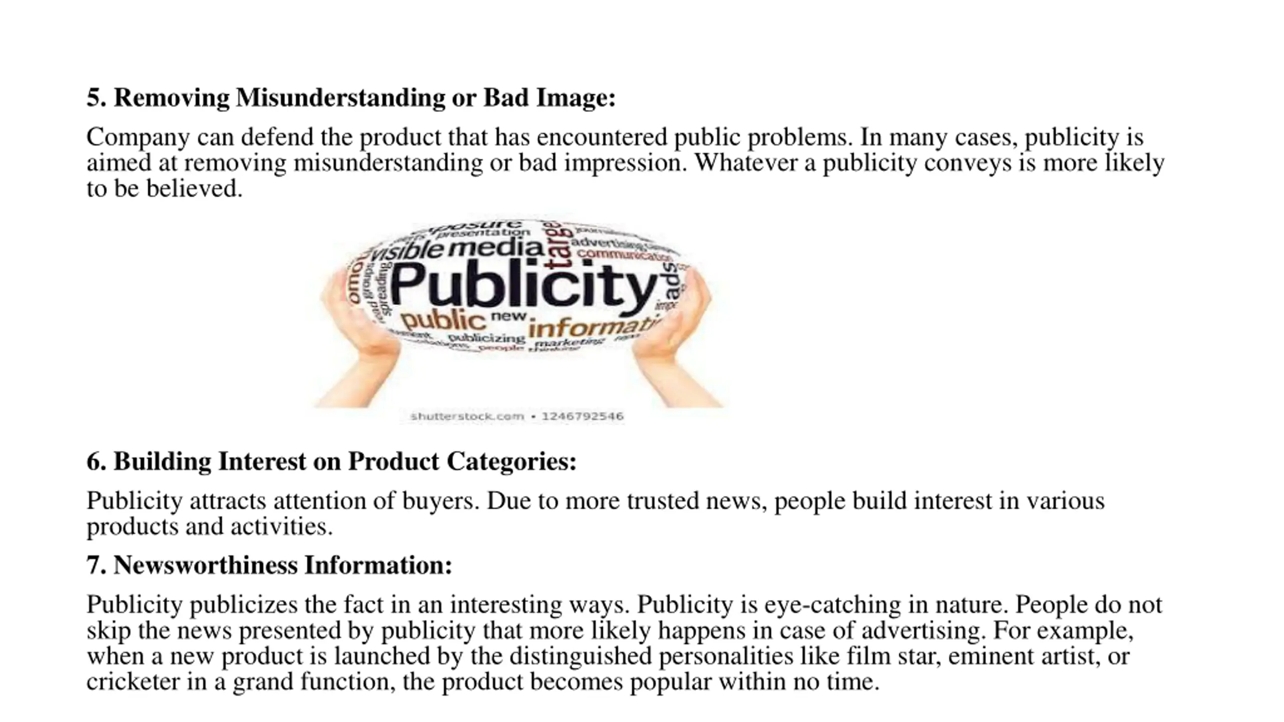 5. Removing Misunderstanding or Bad Image: Company can defend the product that has encountered public problems. In many cases, publicity is aimed at removing misunderstanding or bad impression. Whatever a publicity conveys is more likely to be believed. 6. Building Interest on Product Categories: Publicity attracts attention of buyers. Due to more trusted news, people build interest in various products and activities. 7. Newsworthiness Information: Publicity publicizes the fact in an interesting ways. Publicity is eye-catching in nature. People do not skip the news presented by publicity that more likely happens in case of advertising. For example, when a new product is launched by the distinguished personalities like film star, eminent artist, or cricketer in a grand function, the product becomes popular within no time.