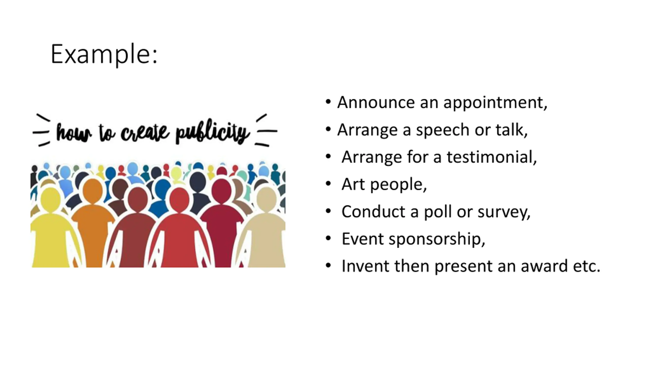 Example: Announce an appointment, Arrange a speech or talk, Arrange for a testimonial, Art people, Conduct a poll or survey, Event sponsorship, Invent then present an award etc.
