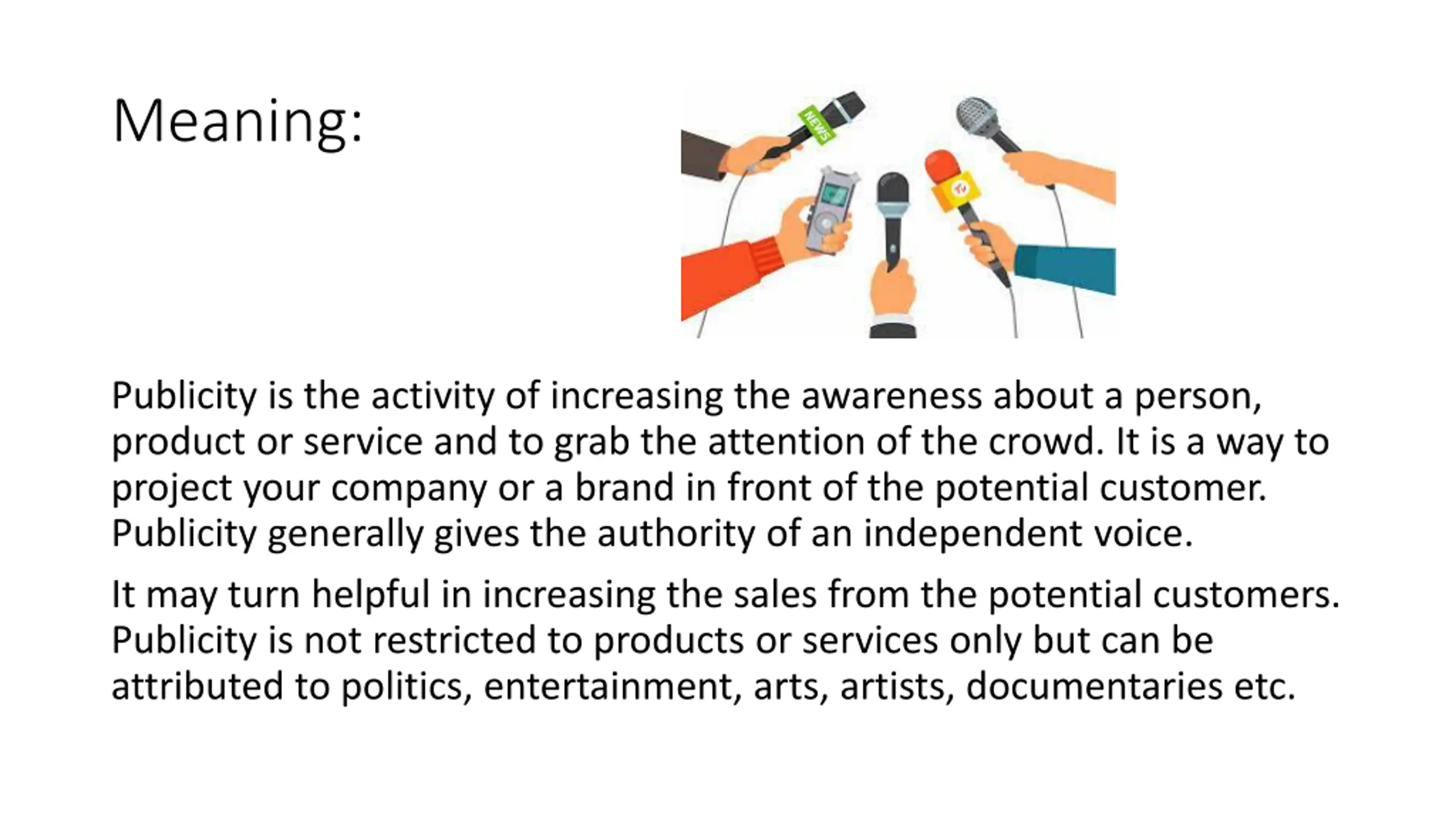 Meaning: Publicity is the activity of increasing the awareness about a person, product or service and to grab the attention of the crowd. It is a way to project your company or a brand in front of the potential customer. Publicity generally gives the authority of an independent voice. It may turn helpful in increasing the sales from the potential customers. Publicity is not restricted to products or services only but can be attributed to politics, entertainment, arts, artists, documentaries etc.