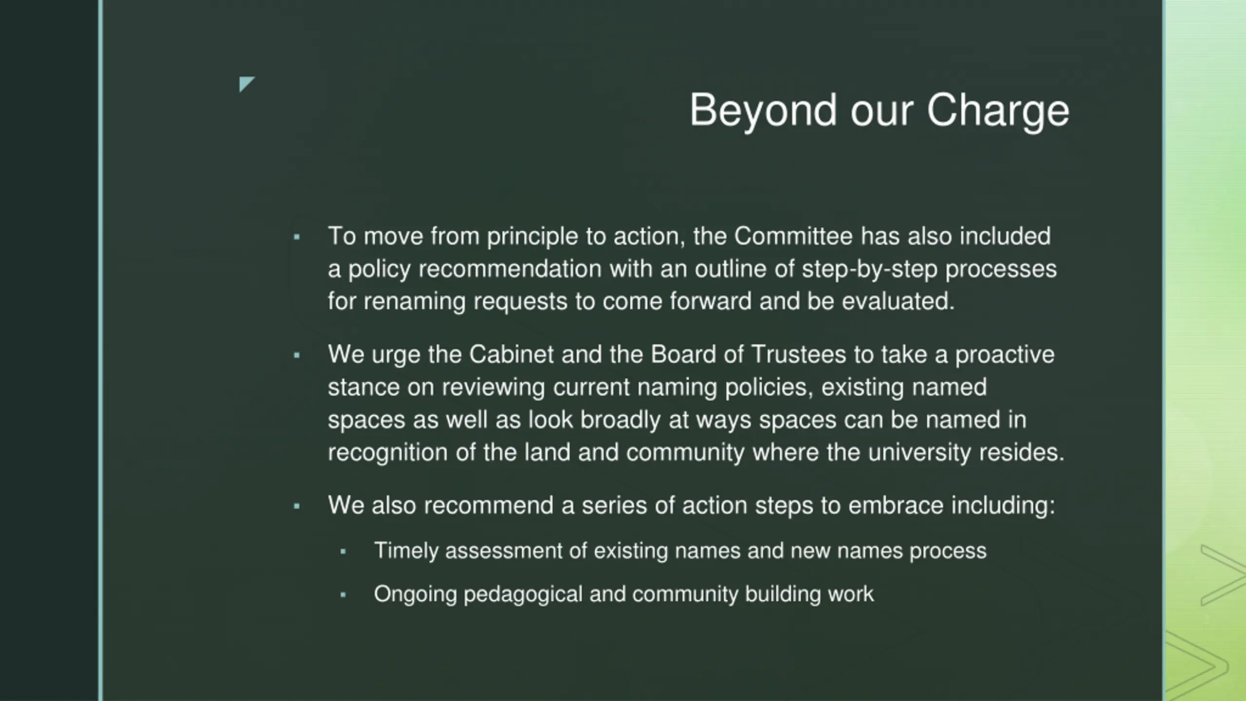 Beyond our Charge To move from principle to action, the Committee has also included a policy recommendation with an outline of step-by-step processes for renaming requests to come forward and be evaluated. We urge the Cabinet and the Board of Trustees to take a proactive stance on reviewing current naming policies, existing named spaces as well as look broadly at ways spaces can be named in recognition of the land and community where the university resides. We also recommend a series of action steps to embrace including: Timely assessment of existing names and new names process Ongoing pedagogical and community building work