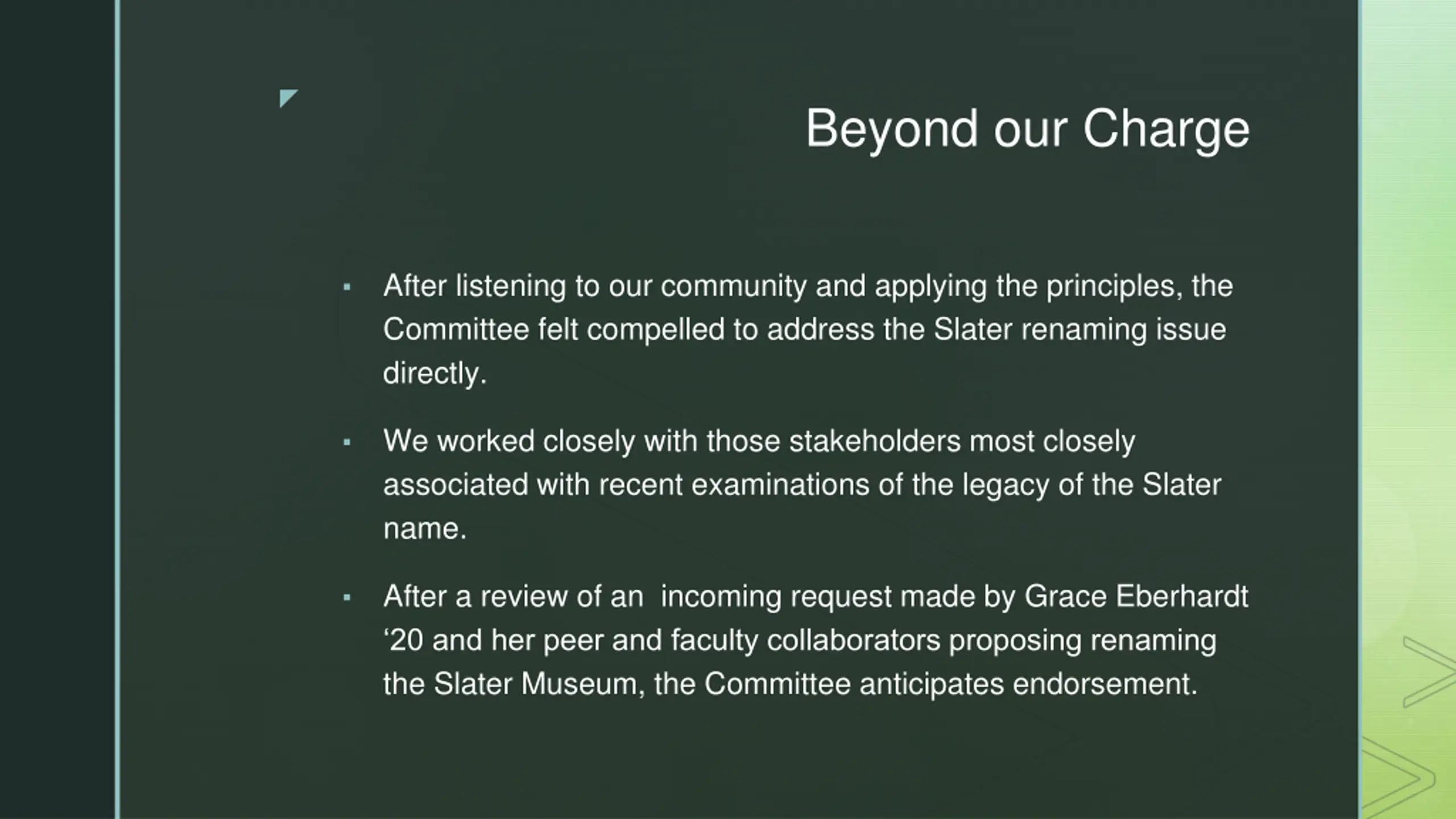 Beyond our Charge After listening to our community and applying the principles, the Committee felt compelled to address the Slater renaming issue directly. We worked closely with those stakeholders most closely associated with recent examinations of the legacy of the Slater name. After a review of an incoming request made by Grace Eberhardt 20 and her peer and faculty collaborators proposing renaming the Slater Museum, the Committee anticipates endorsement.