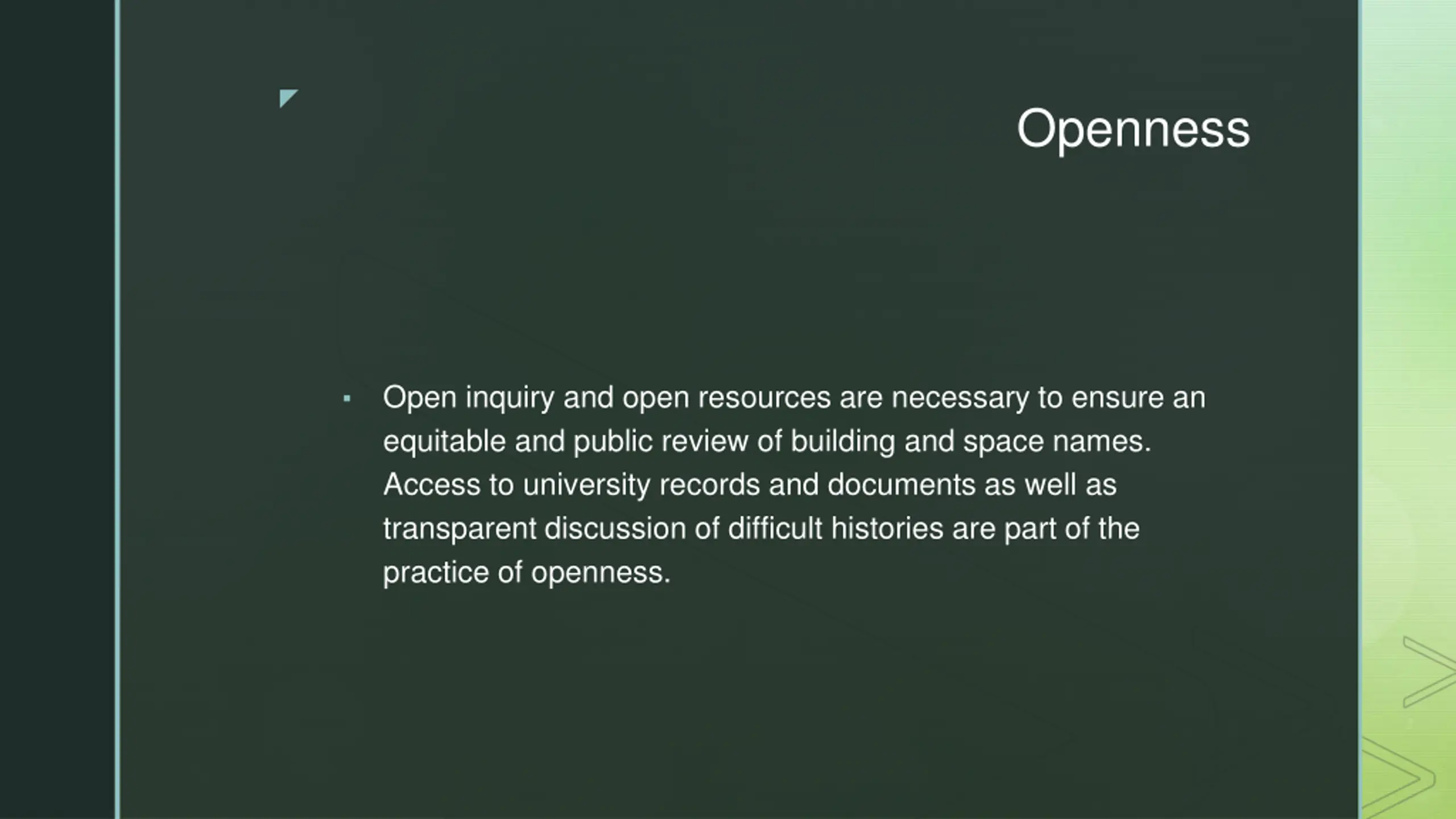 Openness Open inquiry and open resources are necessary to ensure an equitable and public review of building and space names. Access to university records and documents as well as transparent discussion of difficult histories are part of the practice of openness.