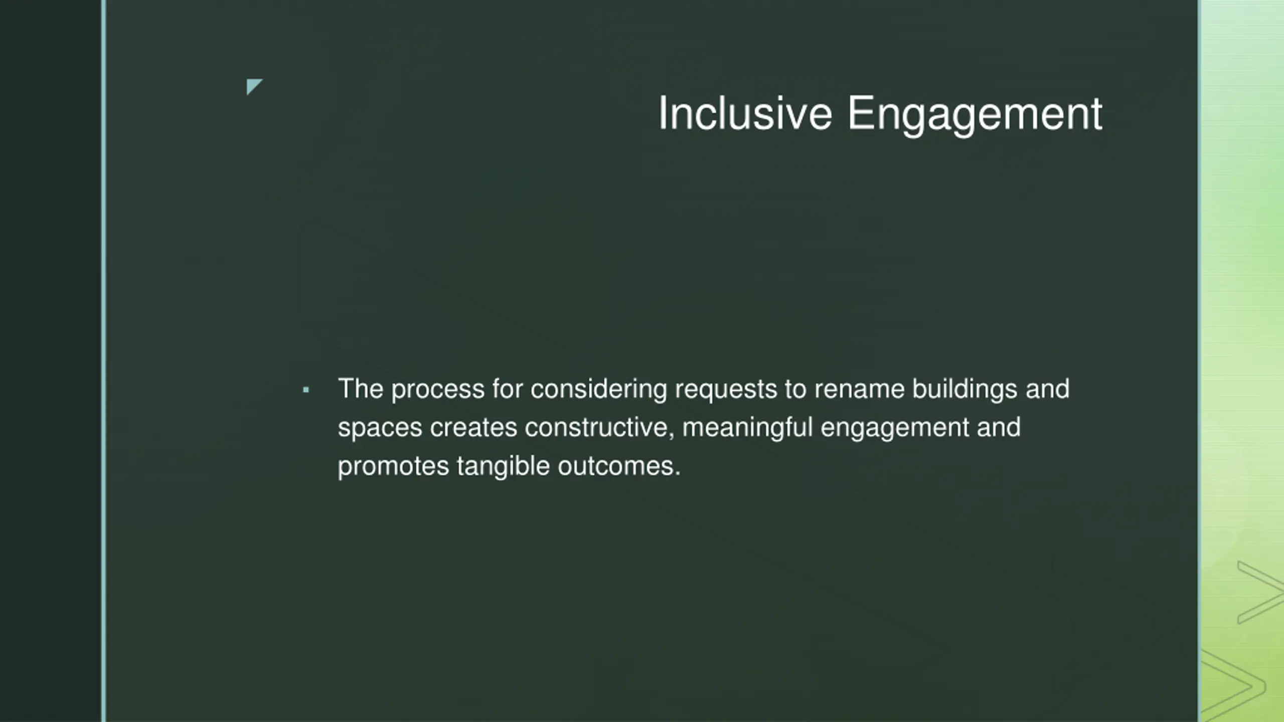 Inclusive Engagement The process for considering requests to rename buildings and spaces creates constructive, meaningful engagement and promotes tangible outcomes.