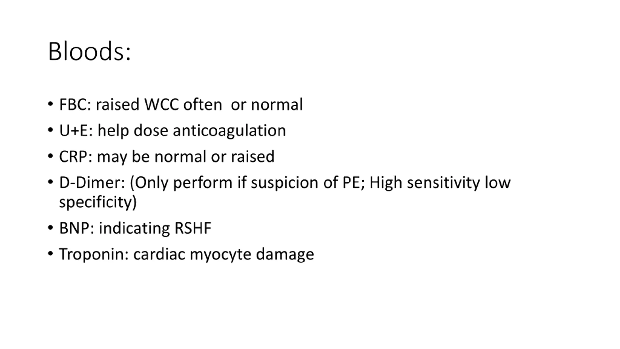 Bloods: FBC: raised WCC often or normal U+E: help dose anticoagulation CRP: may be normal or raised D-Dimer: (Only perform if suspicion of PE; High sensitivity low specificity) BNP: indicating RSHF Troponin: cardiac myocyte damage