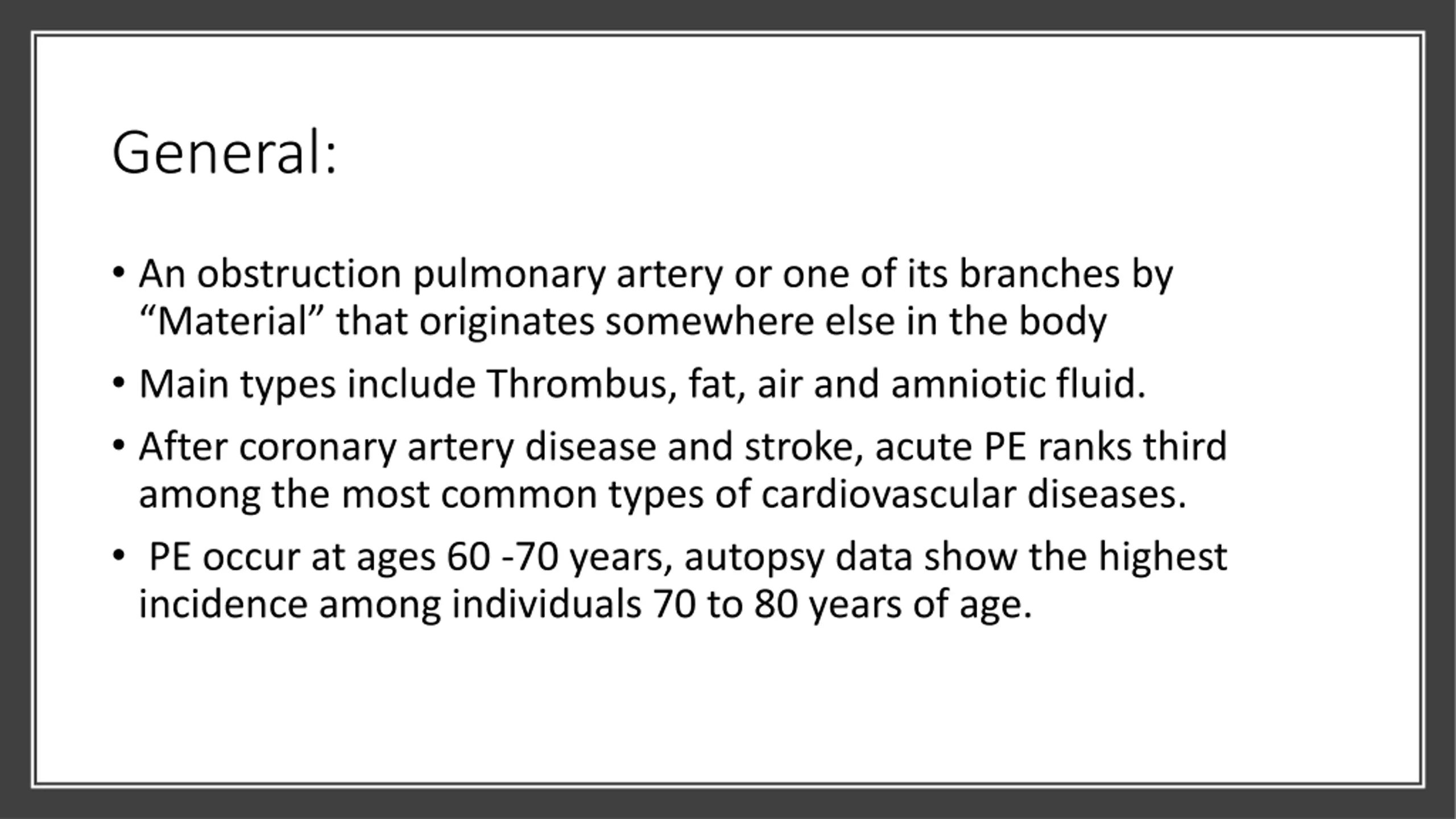 General: An obstruction pulmonary artery or one of its branches by Material that originates somewhere else in the body Main types include Thrombus, fat, air and amniotic fluid. After coronary artery disease and stroke, acute PE ranks third among the most common types of cardiovascular diseases. PE occur at ages 60 -70 years, autopsy data show the highest incidence among individuals 70 to 80 years of age.