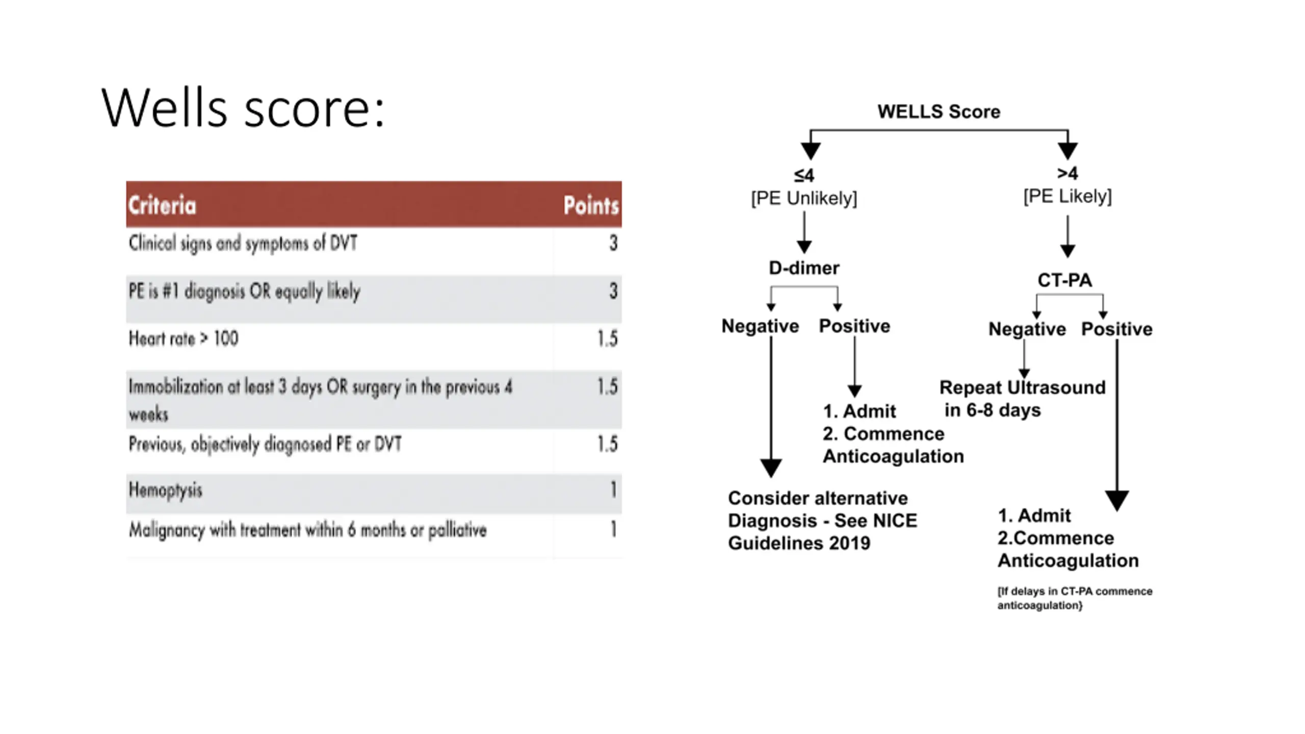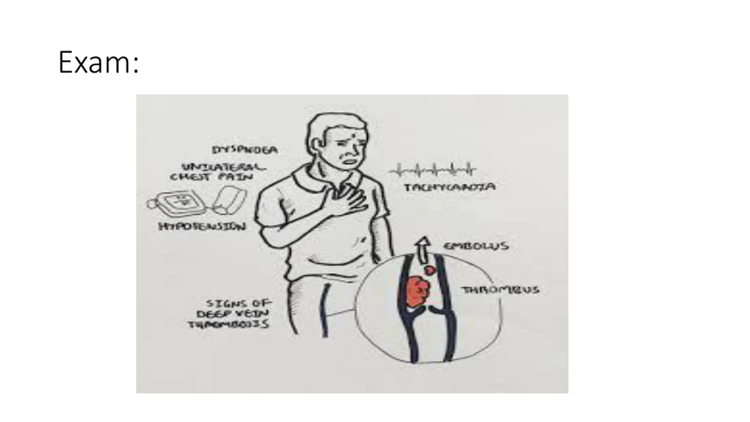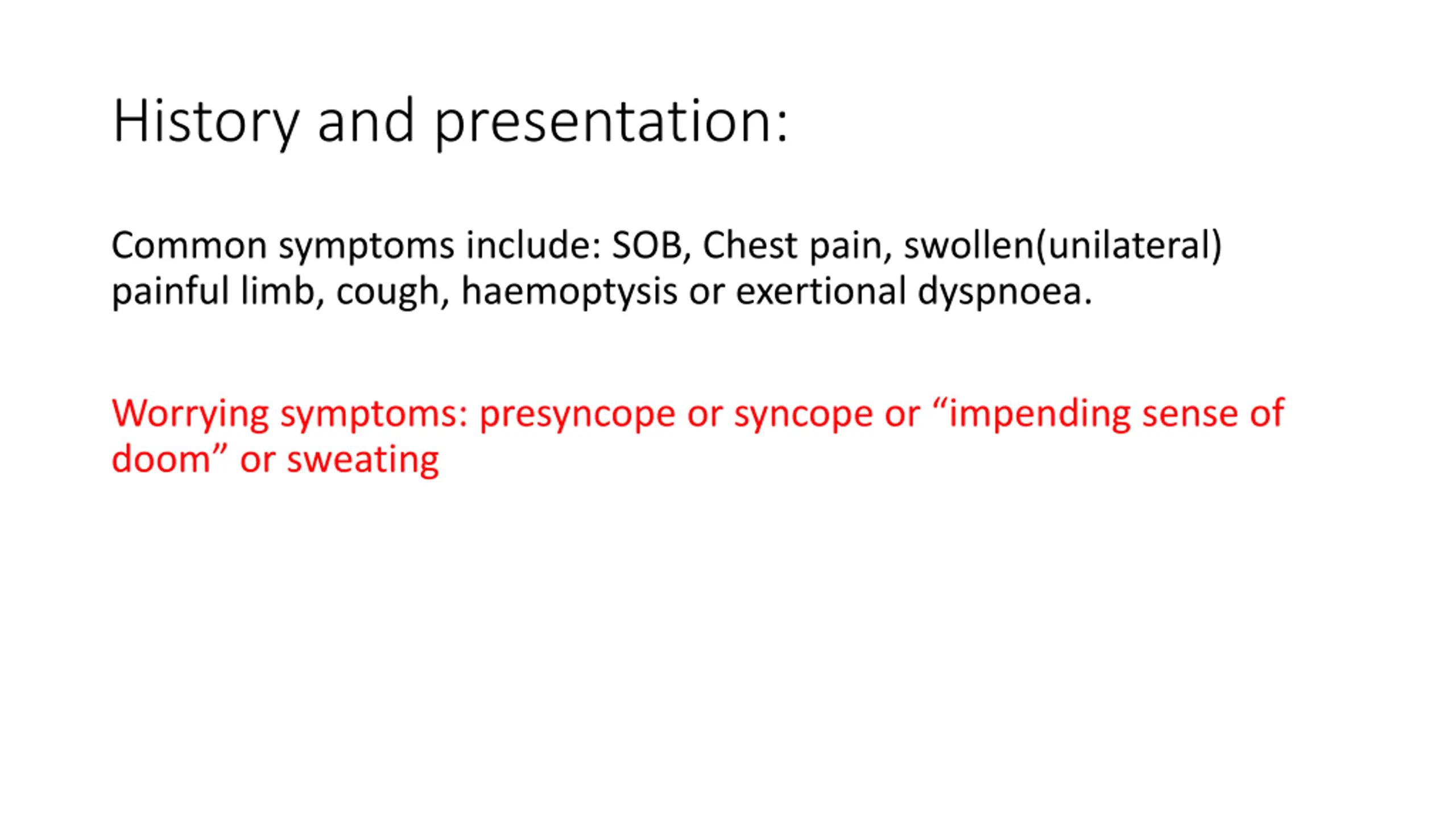 History and presentation: Common symptoms include: SOB, Chest pain, swollen(unilateral) painful limb, cough, haemoptysis or exertional dyspnoea. Worrying symptoms: presyncope or syncope or impending sense of doom or sweating