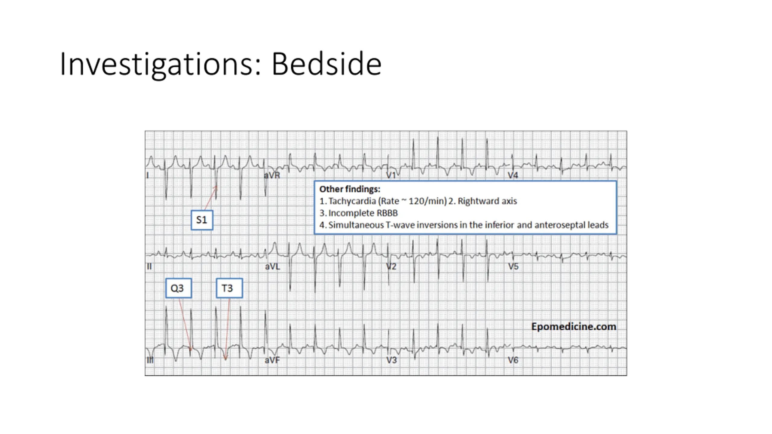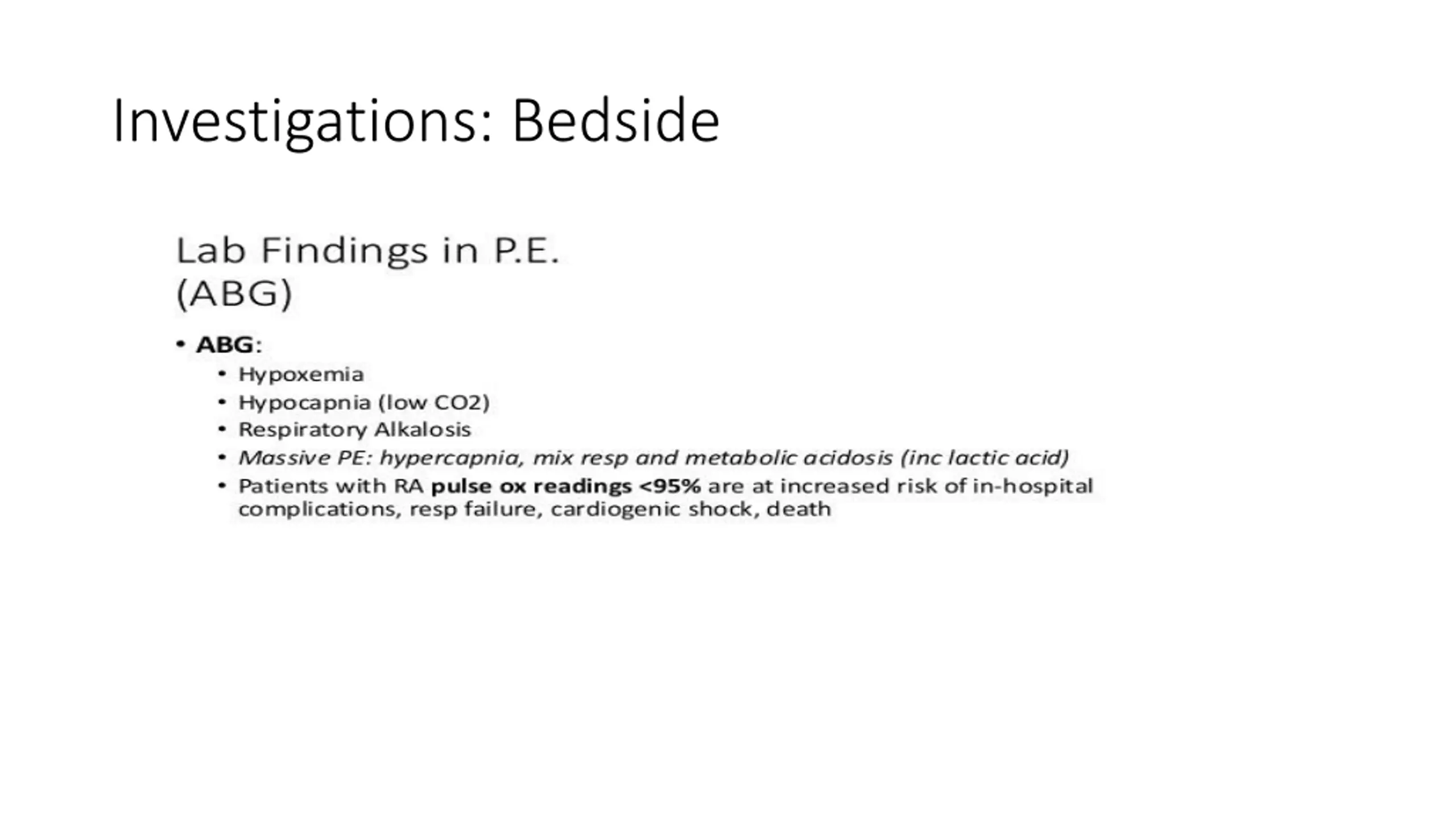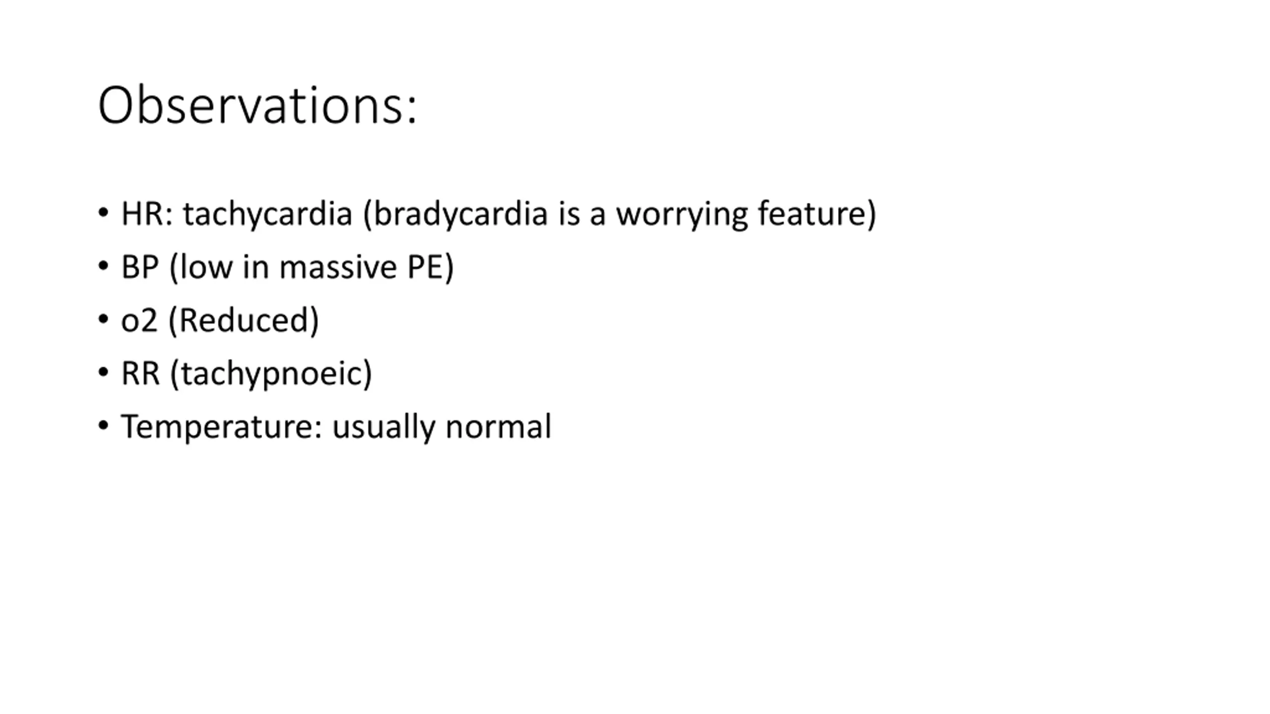 Observations: HR: tachycardia (bradycardia is a worrying feature) BP (low in massive PE) o2 (Reduced) RR (tachypnoeic) Temperature: usually normal