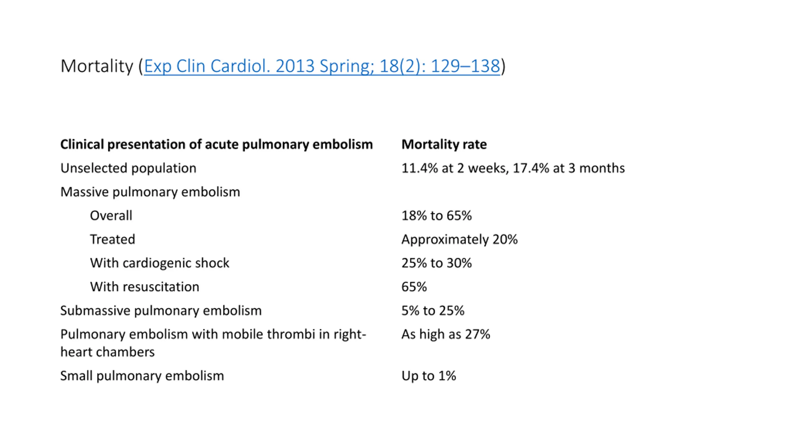 Mortality (Exp Clin Cardiol. 2013 Spring; 18(2): 129138) Clinical presentation of acute pulmonary embolism Mortality rate Unselected population 11.4% at 2 weeks, 17.4% at 3 months Massive pulmonary embolism Overall 18% to 65% Treated Approximately 20% With cardiogenic shock 25% to 30% With resuscitation 65% Submassive pulmonary embolism 5% to 25% Pulmonary embolism with mobile thrombi in right- heart chambers As high as 27% Small pulmonary embolism Up to 1%