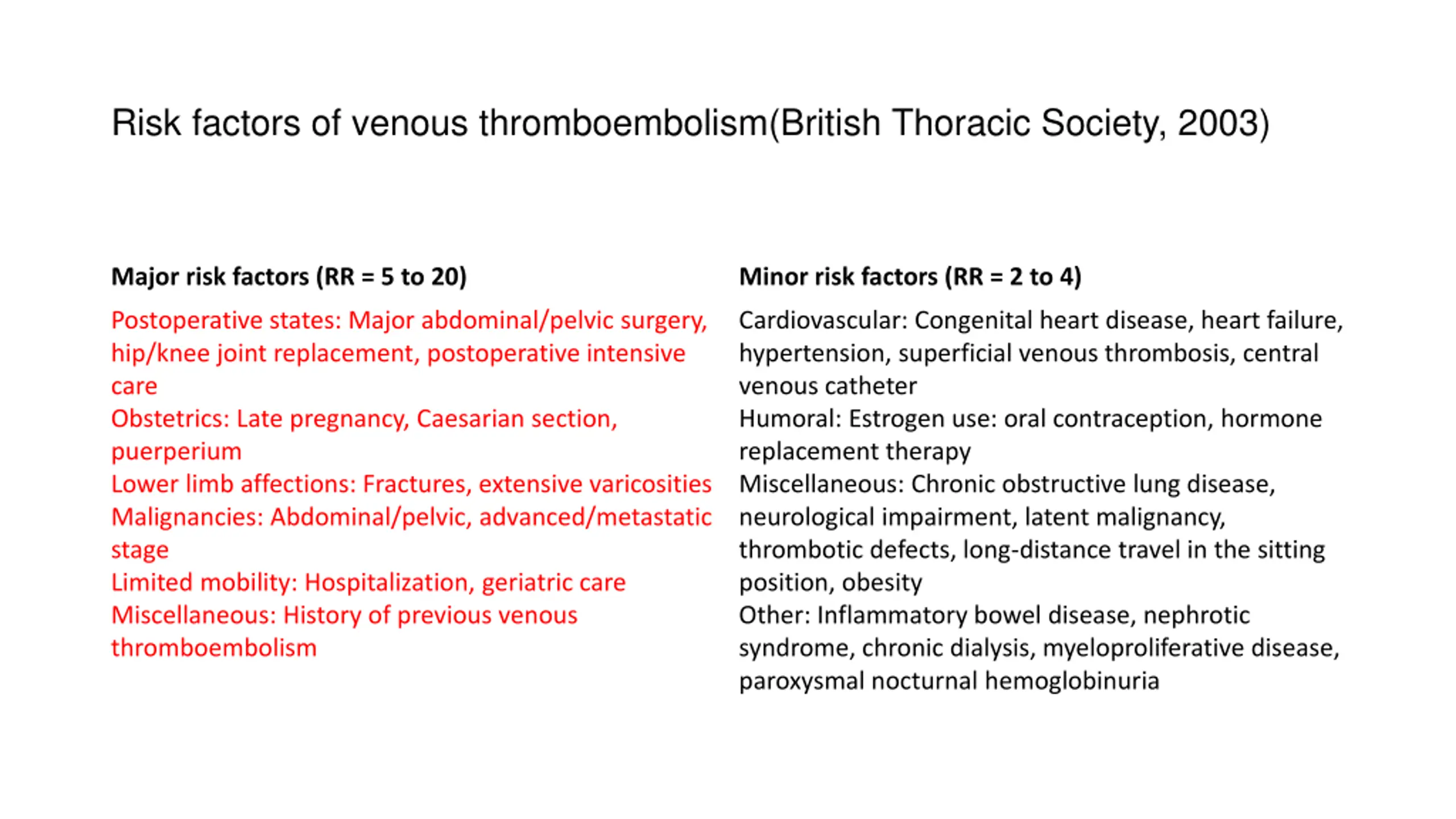 Risk factors of venous thromboembolism(British Thoracic Society, 2003) Major risk factors (RR = 5 to 20) Minor risk factors (RR = 2 to 4) Postoperative states: Major abdominal/pelvic surgery, hip/knee joint replacement, postoperative intensive care Obstetrics: Late pregnancy, Caesarian section, puerperium Lower limb affections: Fractures, extensive varicosities Malignancies: Abdominal/pelvic, advanced/metastatic stage Limited mobility: Hospitalization, geriatric care Miscellaneous: History of previous venous thromboembolism Cardiovascular: Congenital heart disease, heart failure, hypertension, superficial venous thrombosis, central venous catheter Humoral: Estrogen use: oral contraception, hormone replacement therapy Miscellaneous: Chronic obstructive lung disease, neurological impairment, latent malignancy, thrombotic defects, long-distance travel in the sitting position, obesity Other: Inflammatory bowel disease, nephrotic syndrome, chronic dialysis, myeloproliferative disease, paroxysmal nocturnal hemoglobinuria