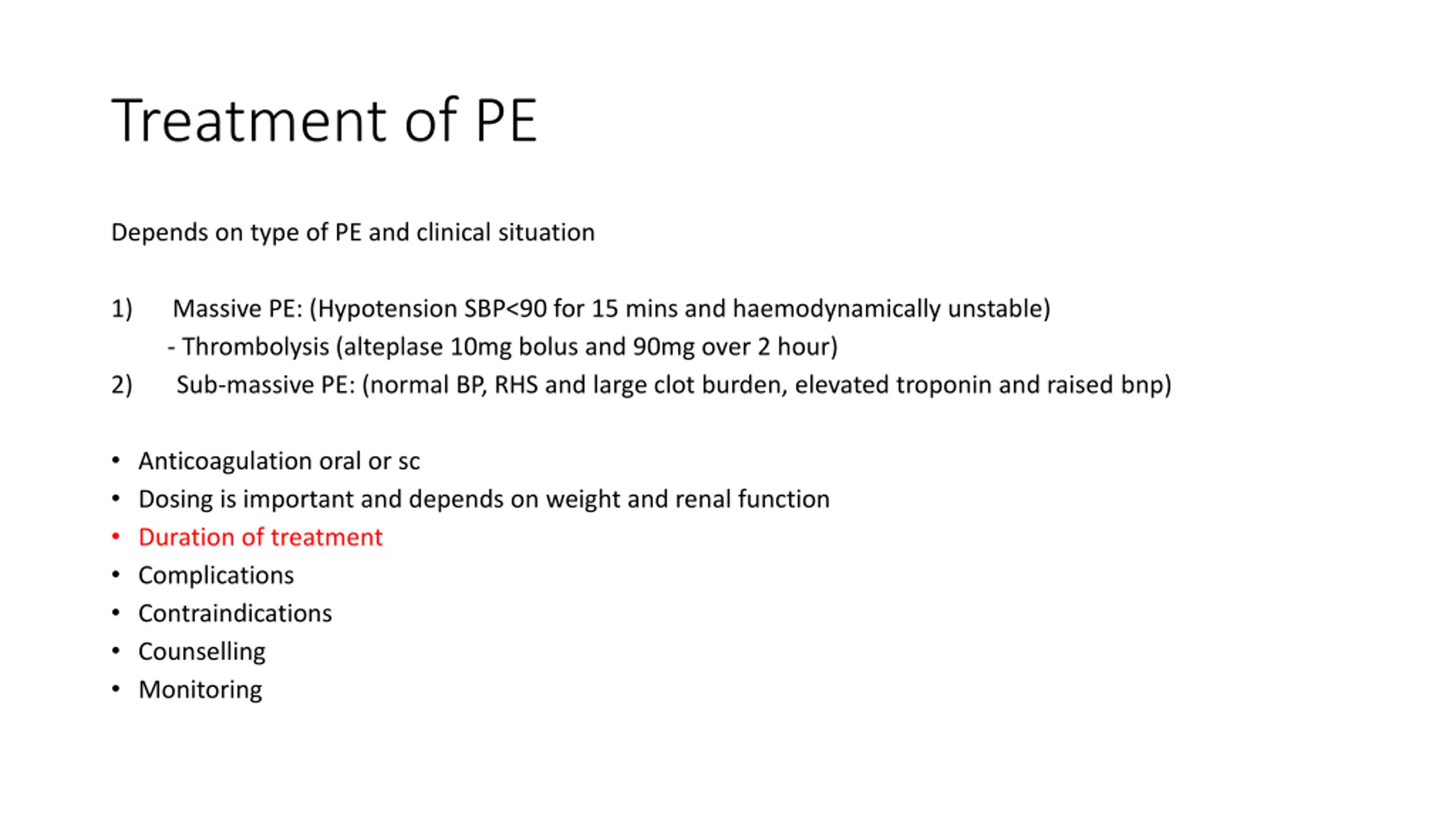Treatment of PE Depends on type of PE and clinical situation 1) Massive PE: (Hypotension SBP<90 for 15 mins and haemodynamically unstable) - Thrombolysis (alteplase 10mg bolus and 90mg over 2 hour) 2) Sub-massive PE: (normal BP, RHS and large clot burden, elevated troponin and raised bnp) Anticoagulation oral or sc Dosing is important and depends on weight and renal function Duration of treatment Complications Contraindications Counselling Monitoring