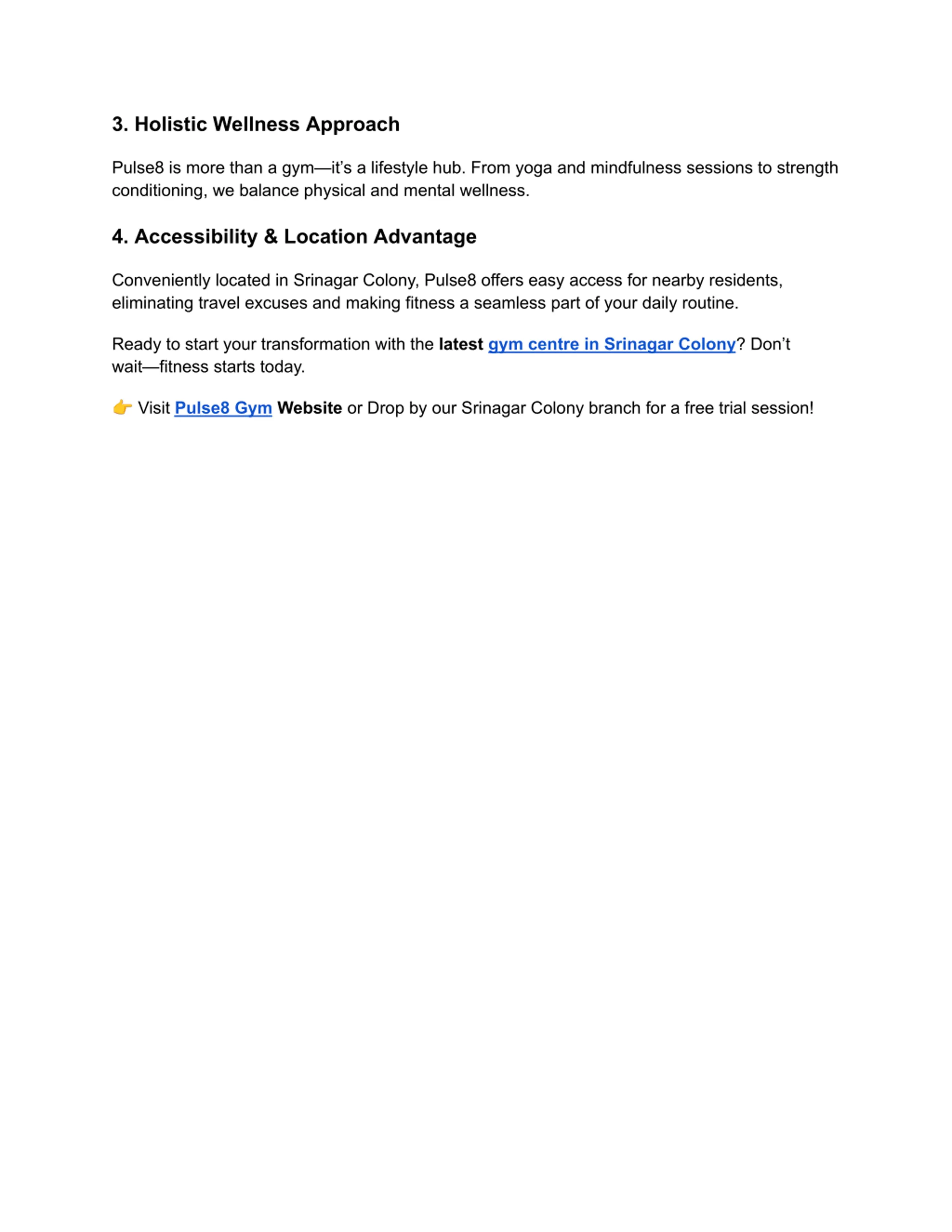 3. Holistic Wellness Approach Pulse8 is more than a gym it s a lifestyle hub. From yoga and mindfulness sessions to strength conditioning, we balance physical and mental wellness. 4. Accessibility & Location Advantage Conveniently located in Srinagar Colony, Pulse8 offers easy access for nearby residents, eliminating travel excuses and making fitness a seamless part of your daily routine. Ready to start your transformation with the latest gym centre in Srinagar Colony? Don t wait fitness starts today. ? Visit Pulse8 Gym Website or Drop by our Srinagar Colony branch for a free trial session!