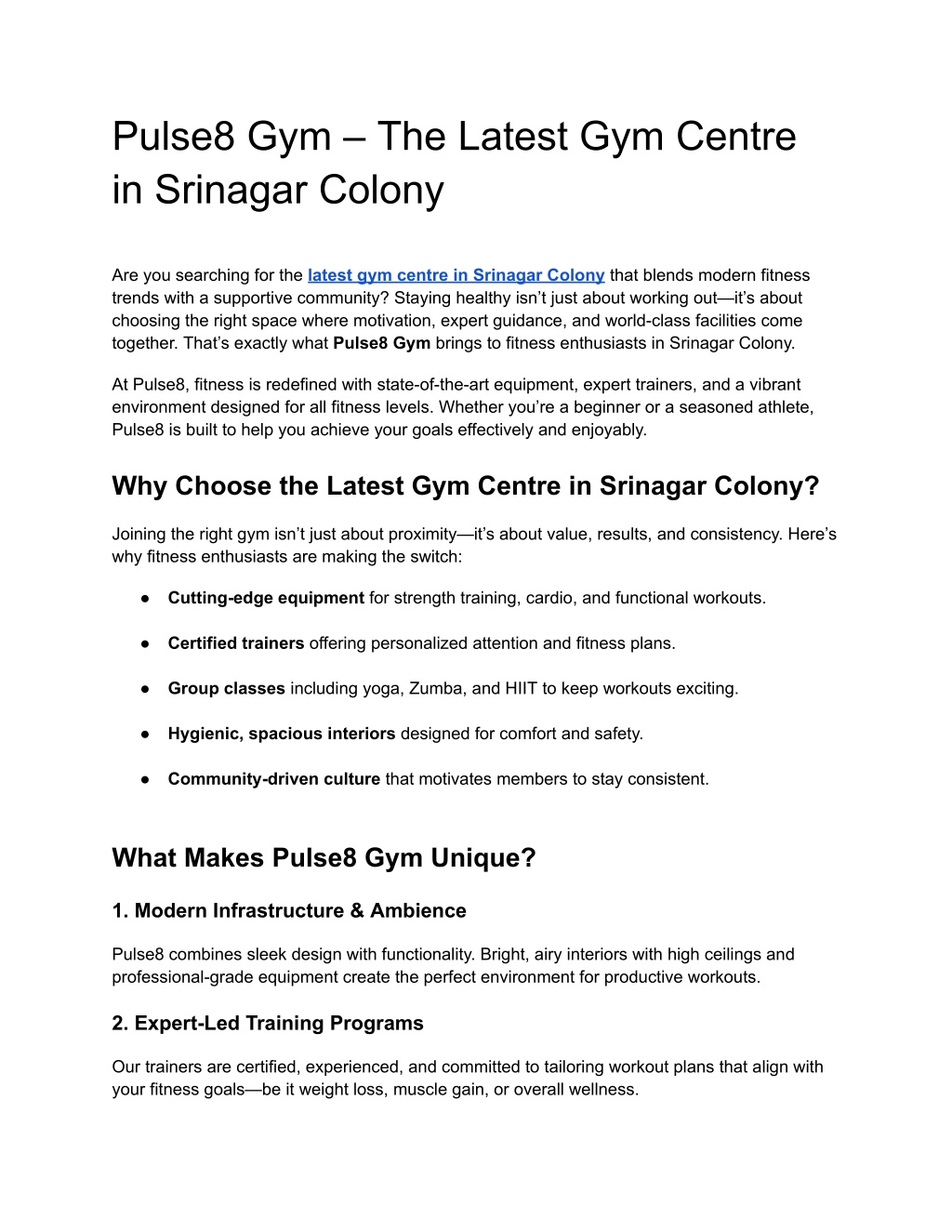 Pulse8 Gym The Latest Gym Centre in Srinagar Colony Are you searching for the latest gym centre in Srinagar Colony that blends modern fitness trends with a supportive community? Staying healthy isn t just about working out it s about choosing the right space where motivation, expert guidance, and world-class facilities come together. That s exactly what Pulse8 Gym brings to fitness enthusiasts in Srinagar Colony. At Pulse8, fitness is redefined with state-of-the-art equipment, expert trainers, and a vibrant environment designed for all fitness levels. Whether you re a beginner or a seasoned athlete, Pulse8 is built to help you achieve your goals effectively and enjoyably. Why Choose the Latest Gym Centre in Srinagar Colony? Joining the right gym isn t just about proximity it s about value, results, and consistency. Here s why fitness enthusiasts are making the switch: Cutting-edge equipment for strength training, cardio, and functional workouts. Certified trainers offering personalized attention and fitness plans. Group classes including yoga, Zumba, and HIIT to keep workouts exciting. Hygienic, spacious interiors designed for comfort and safety. Community-driven culture that motivates members to stay consistent. What Makes Pulse8 Gym Unique? 1. Modern Infrastructure & Ambience Pulse8 combines sleek design with functionality. Bright, airy interiors with high ceilings and professional-grade equipment create the perfect environment for productive workouts. 2. Expert-Led Training Programs Our trainers are certified, experienced, and committed to tailoring workout plans that align with your fitness goals be it weight loss, muscle gain, or overall wellness.