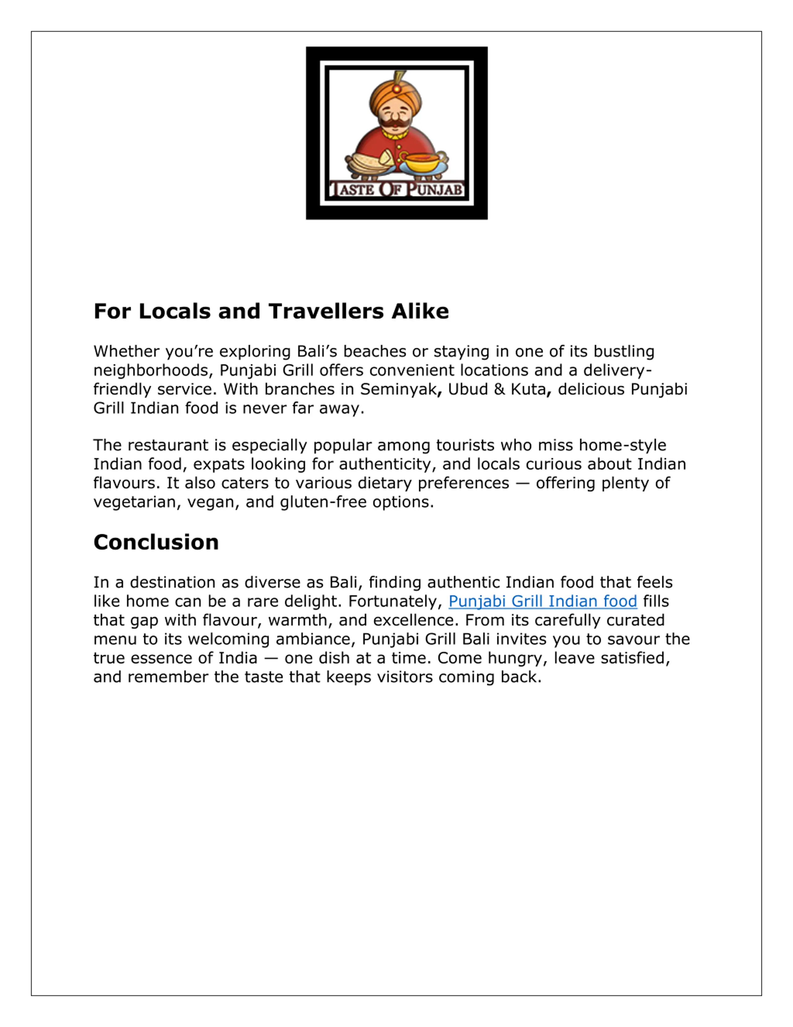 For Locals and Travellers Alike Whether you re exploring Bali s beaches or staying in one of its bustling neighborhoods, Punjabi Grill offers convenient locations and a delivery- friendly service. With branches in Seminyak, Ubud&Kuta, delicious Punjabi Grill Indian food is never far away. The restaurant is especially popular among tourists who miss home-style Indian food, expats looking for authenticity, and locals curious about Indian flavours. It also caters to various dietary preferences offering plenty of vegetarian, vegan, and gluten-free options. Conclusion In a destination as diverse as Bali, finding authentic Indian food that feels like home can be a rare delight. Fortunately, Punjabi Grill Indian food fills that gap with flavour, warmth, and excellence. From its carefully curated menu to its welcoming ambiance, Punjabi Grill Bali invites you to savour the true essence of India one dish at a time. Come hungry, leave satisfied, and remember the taste that keeps visitors coming back.