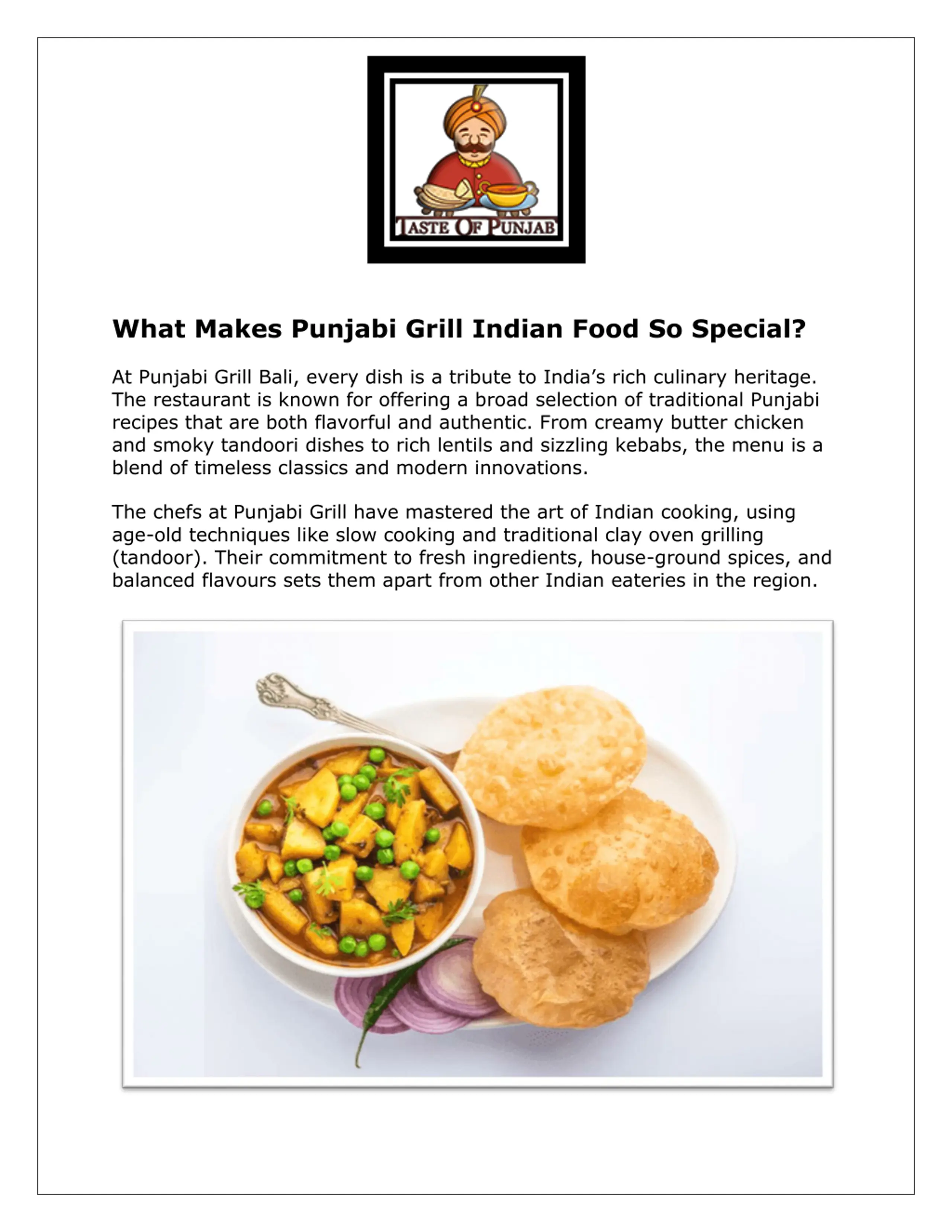 Punjabi Grill Indian Food Where Bali Meets North Indian Flavors When it comes to authentic and aromatic Indian cuisine, few places can match the experience offered by Punjabi Grill Indian food. Nestled in the heart of Bali, Punjabi Grill Bali brings a true taste of North India to the island s thriving culinary scene. Whether you are a tourist seeking comfort food or a local looking to explore new flavours, Punjabi Grill delivers a memorable dining journey through rich spices, vibrant colours, and heartwarming hospitality.