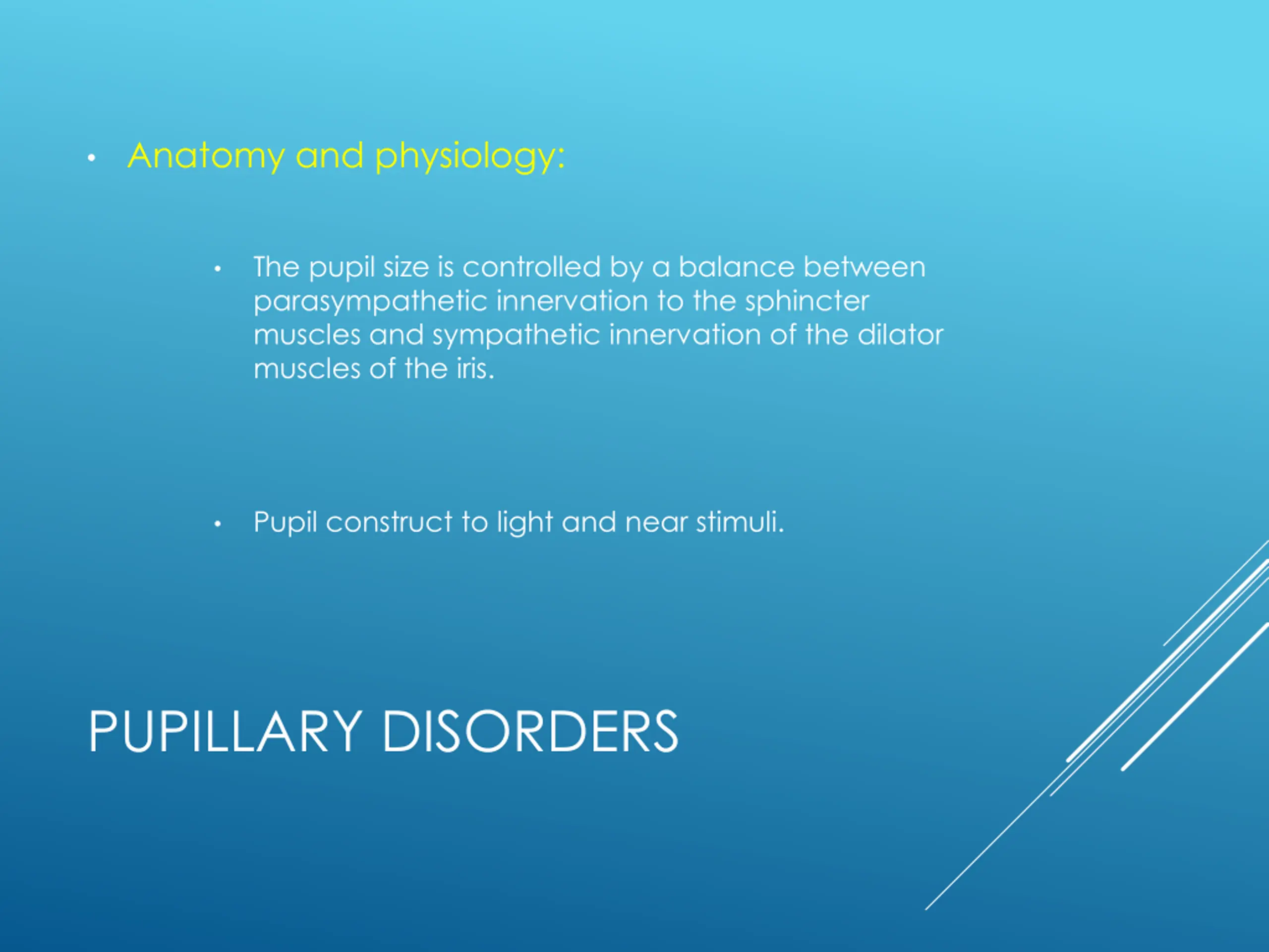 Anatomy and physiology: The pupil size is controlled by a balance between parasympathetic innervation to the sphincter muscles and sympathetic innervation of the dilator muscles of the iris. Pupil construct to light and near stimuli. PUPILLARY DISORDERS
