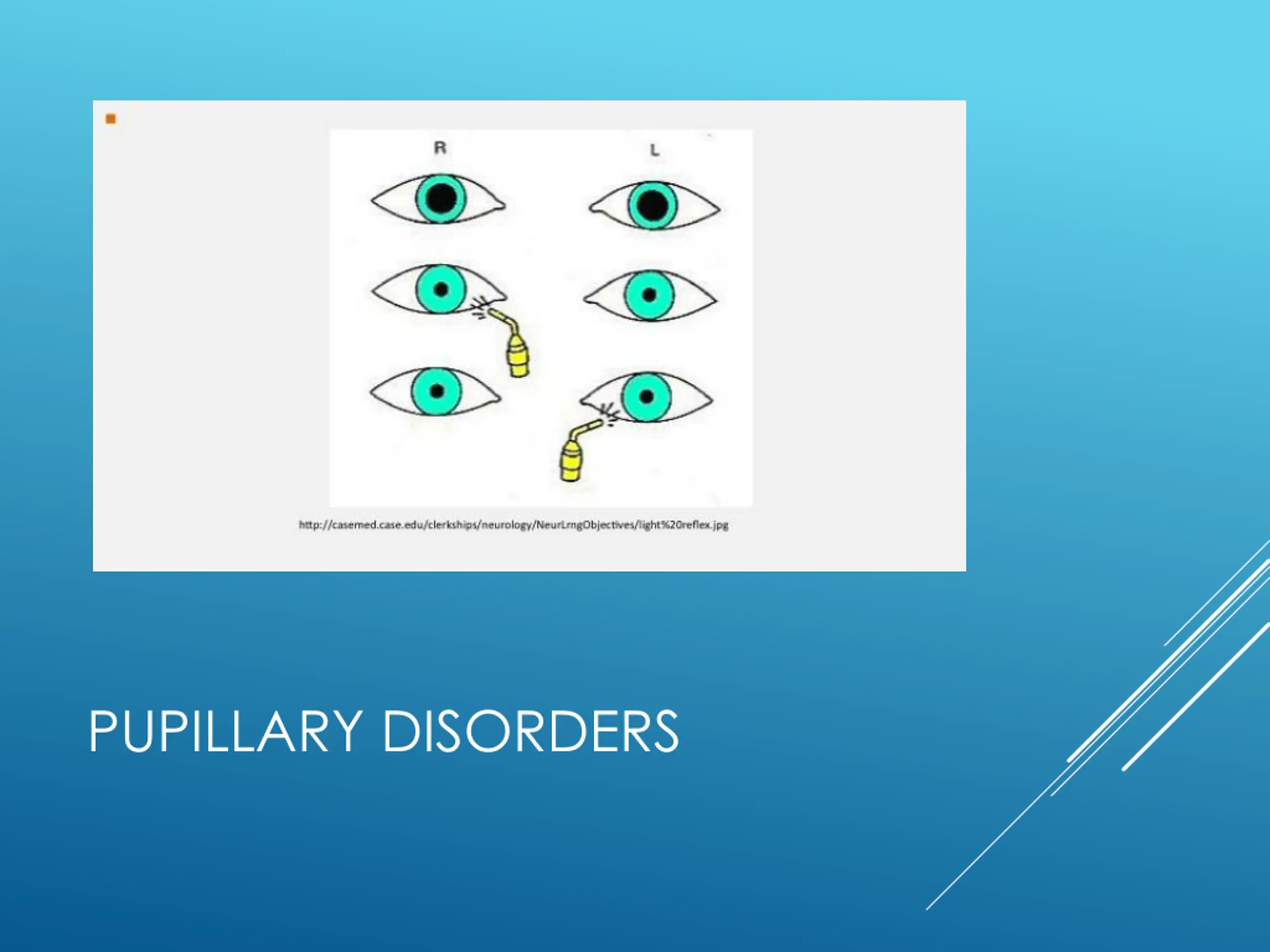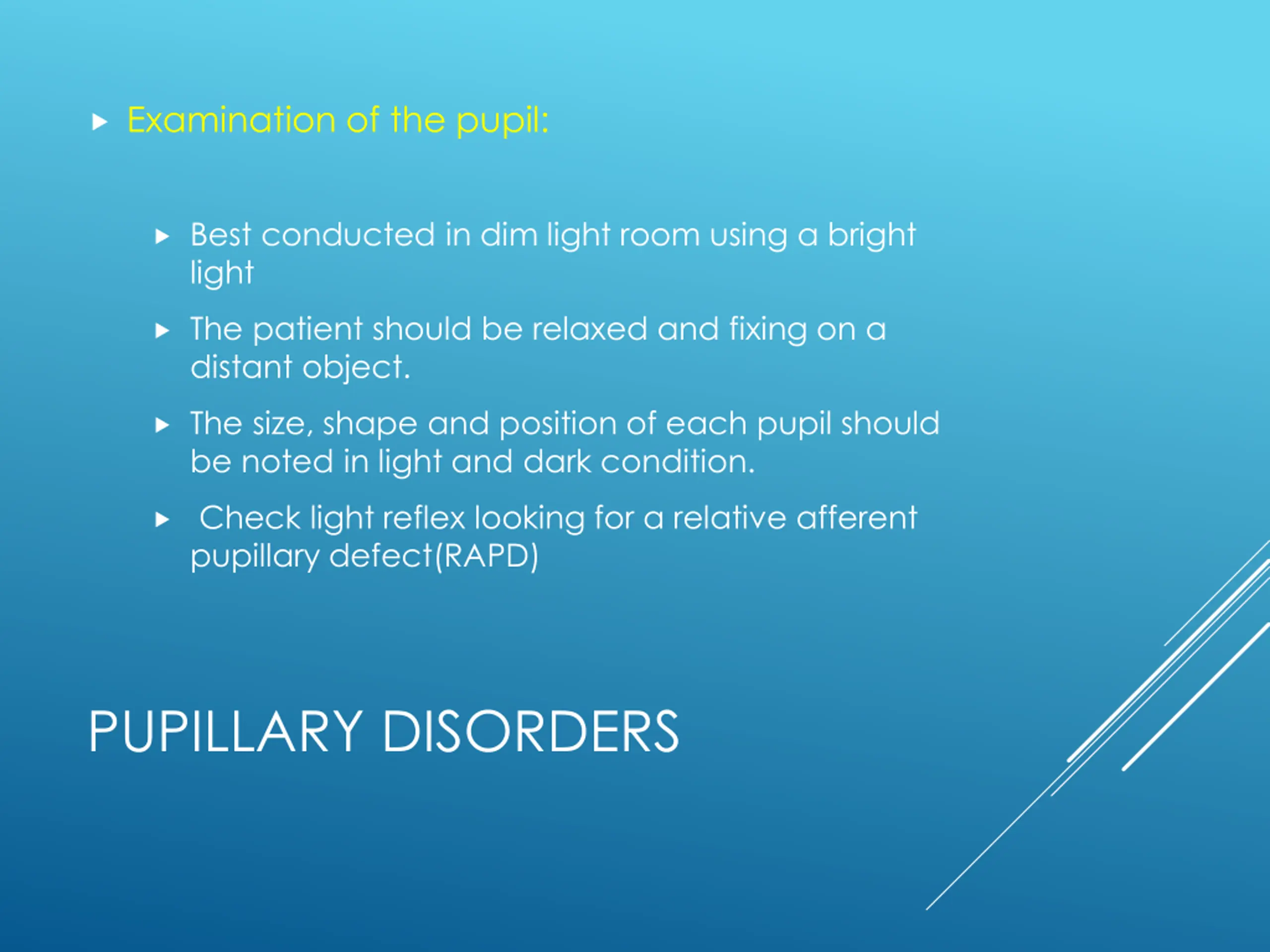 Examination of the pupil: Best conducted in dim light room using a bright light The patient should be relaxed and fixing on a distant object. The size, shape and position of each pupil should be noted in light and dark condition. Check light reflex looking for a relative afferent pupillary defect(RAPD) PUPILLARY DISORDERS