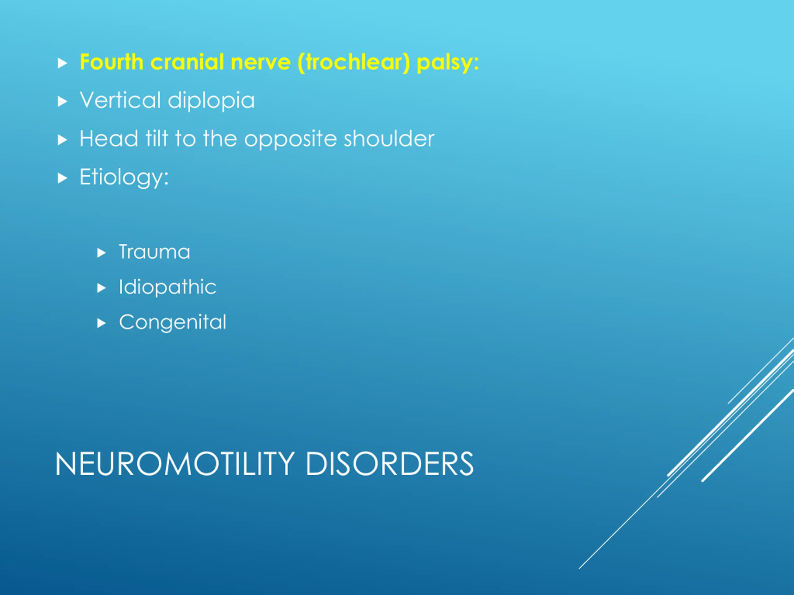 Fourth cranial nerve (trochlear) palsy: Vertical diplopia Head tilt to the opposite shoulder Etiology: Trauma Idiopathic Congenital NEUROMOTILITY DISORDERS