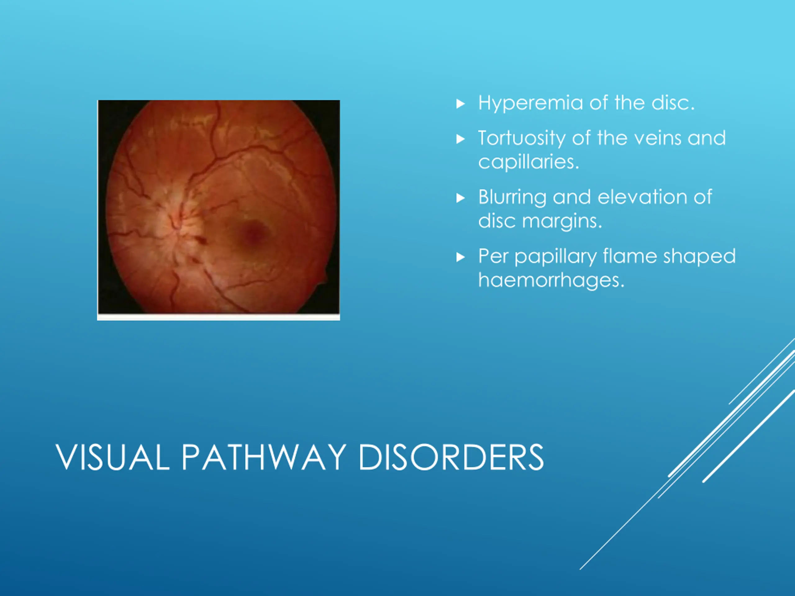 Hyperemia of the disc. Tortuosity of the veins and capillaries. Blurring and elevation of disc margins. Per papillary flame shaped haemorrhages. VISUAL PATHWAY DISORDERS