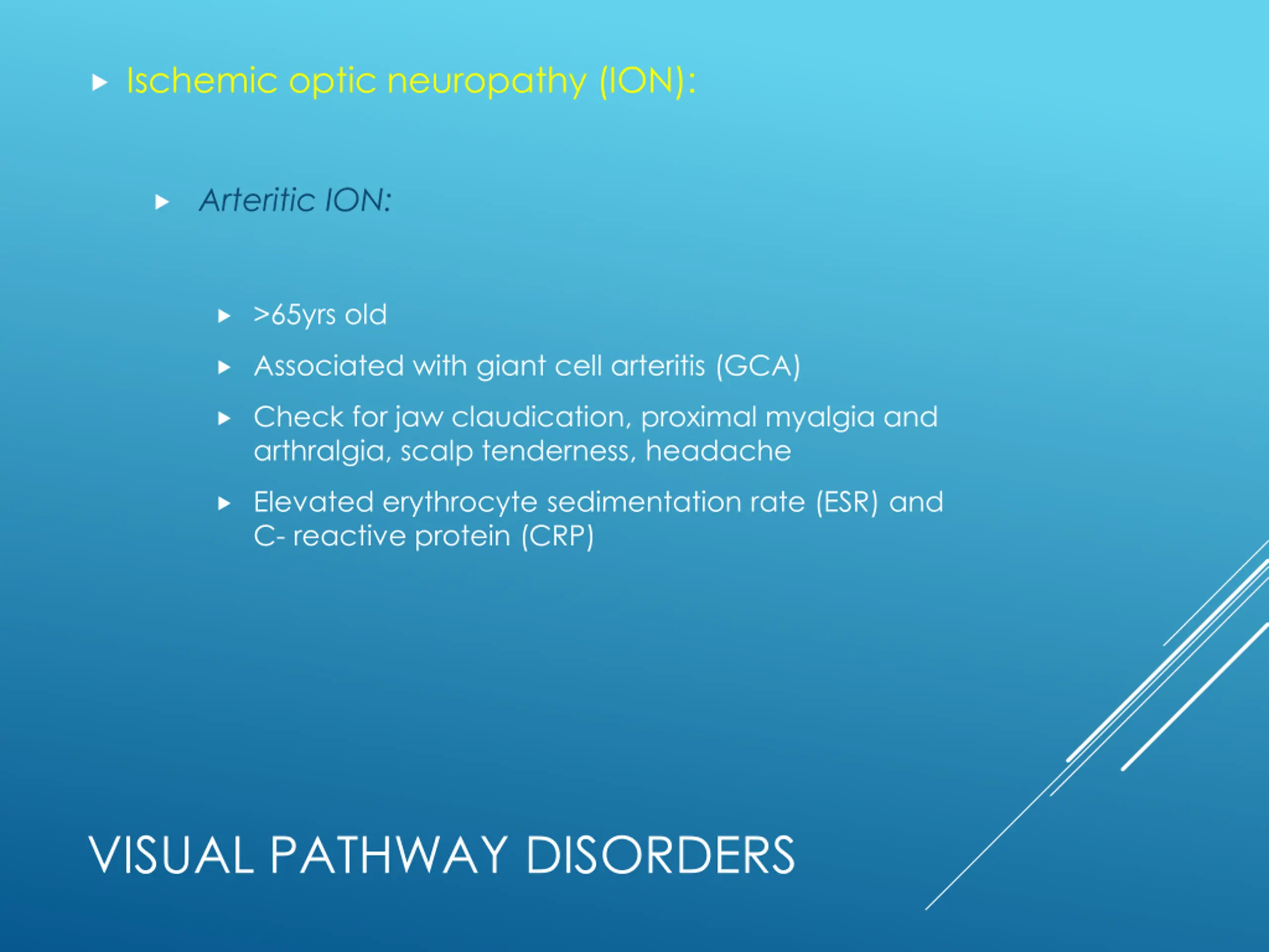 Ischemic optic neuropathy (ION): Arteritic ION: >65yrs old Associated with giant cell arteritis (GCA) Check for jaw claudication, proximal myalgia and arthralgia, scalp tenderness, headache Elevated erythrocyte sedimentation rate (ESR) and C- reactive protein (CRP) VISUAL PATHWAY DISORDERS