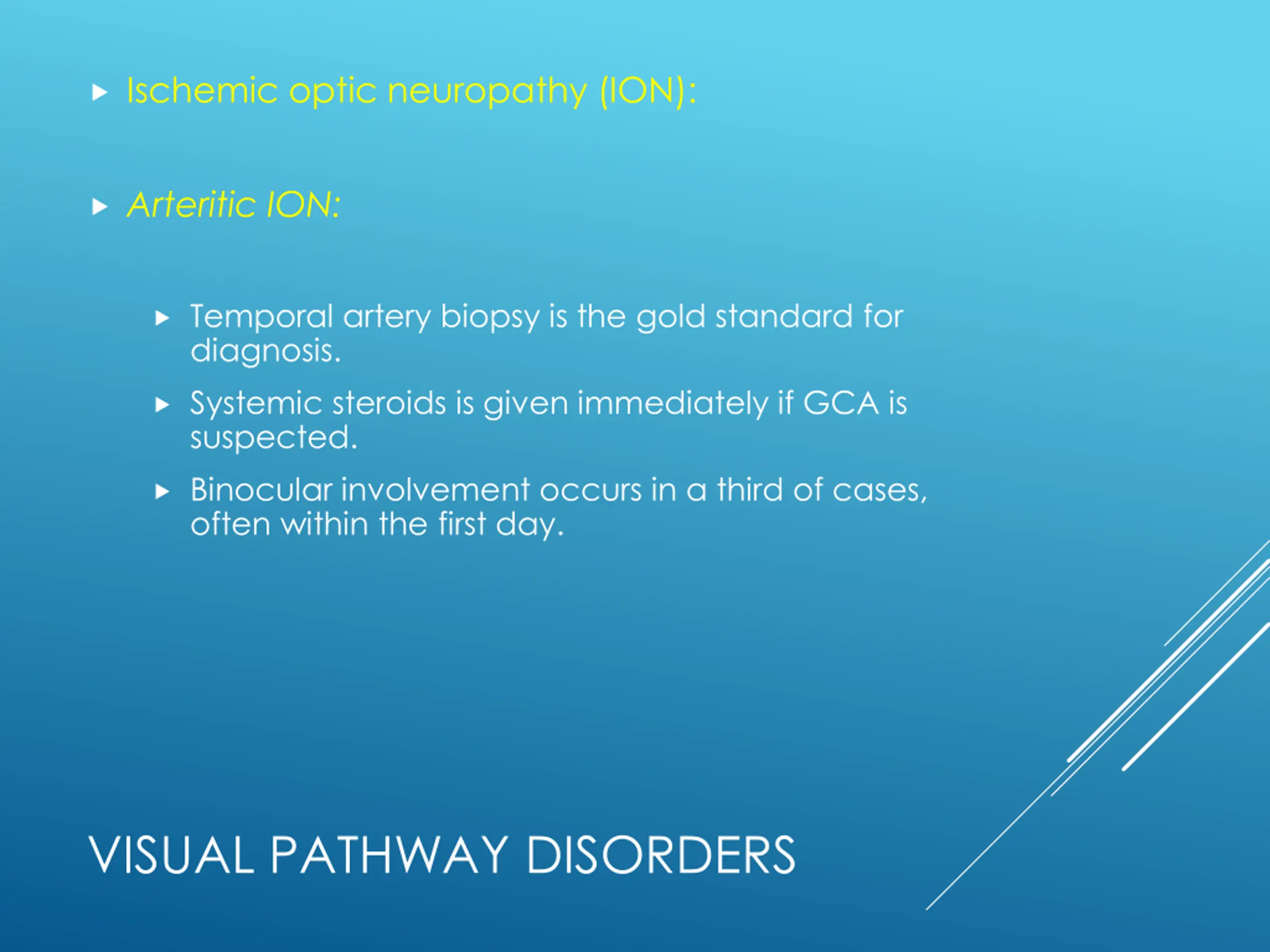 Ischemic optic neuropathy (ION): Arteritic ION: Temporal artery biopsy is the gold standard for diagnosis. Systemic steroids is given immediately if GCA is suspected. Binocular involvement occurs in a third of cases, often within the first day. VISUAL PATHWAY DISORDERS
