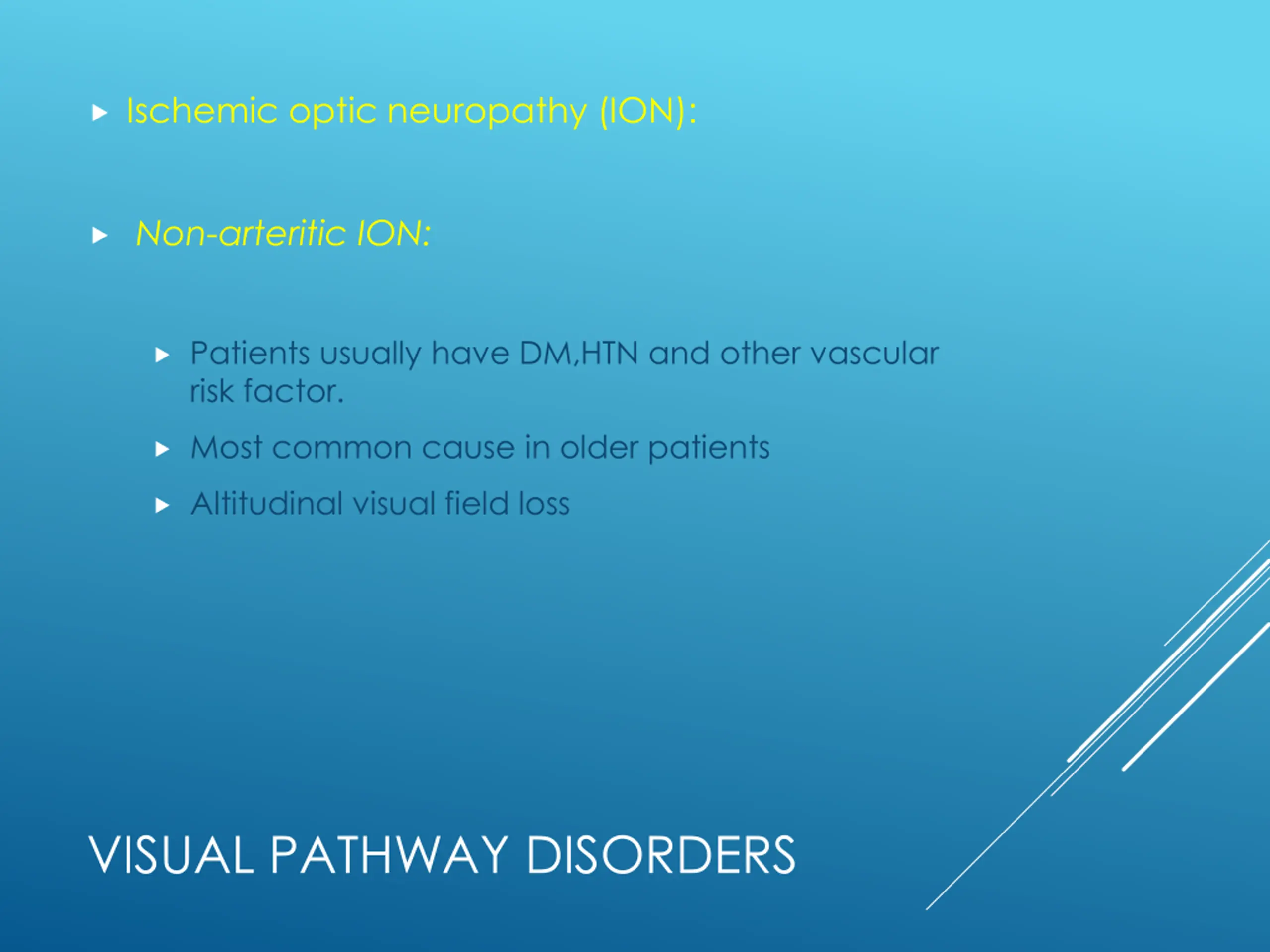 Ischemic optic neuropathy (ION): Non-arteritic ION: Patients usually have DM,HTN and other vascular risk factor. Most common cause in older patients Altitudinal visual field loss VISUAL PATHWAY DISORDERS