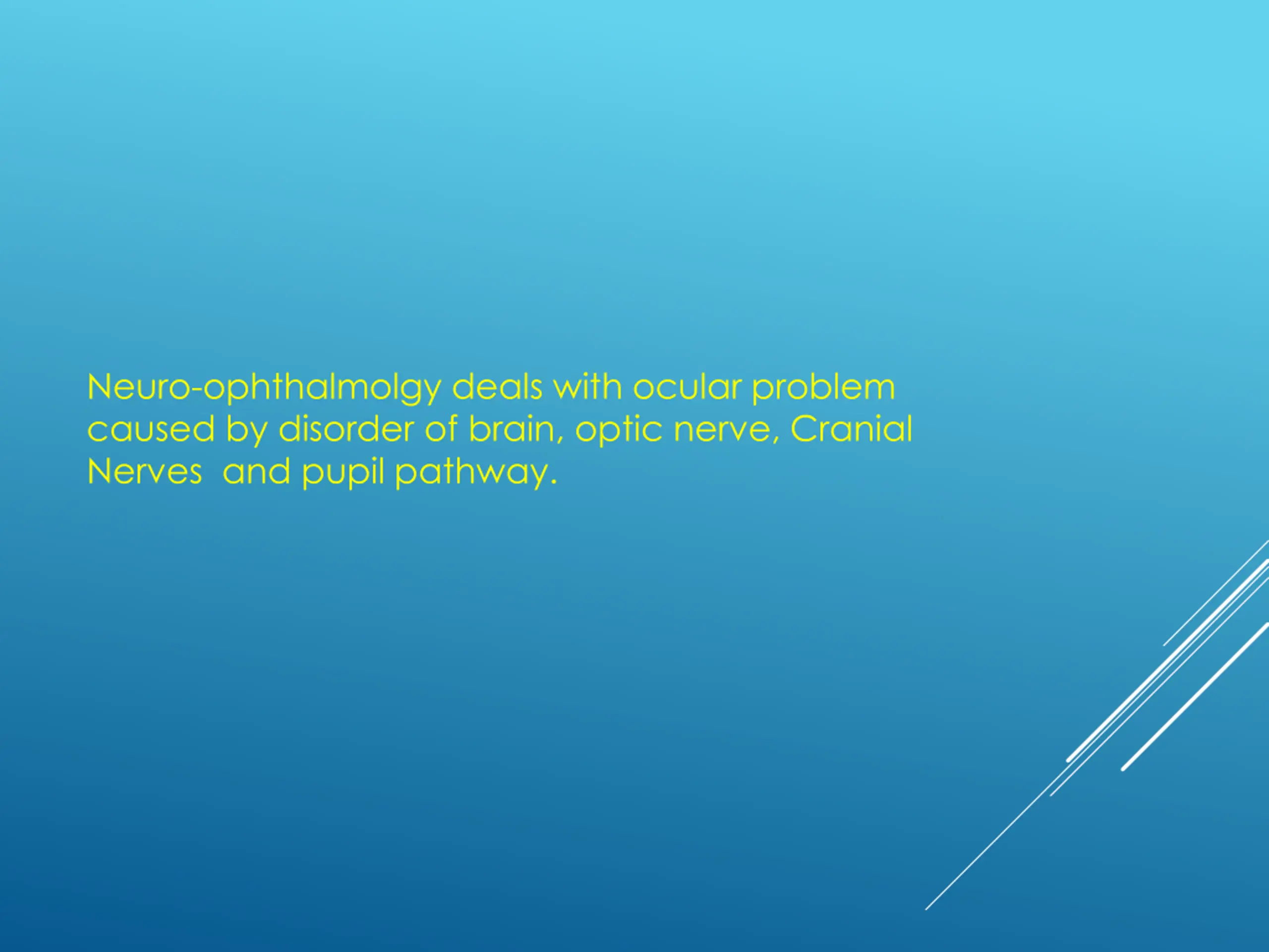 Neuro-ophthalmolgy deals with ocular problem caused by disorder of brain, optic nerve, Cranial Nerves and pupil pathway.