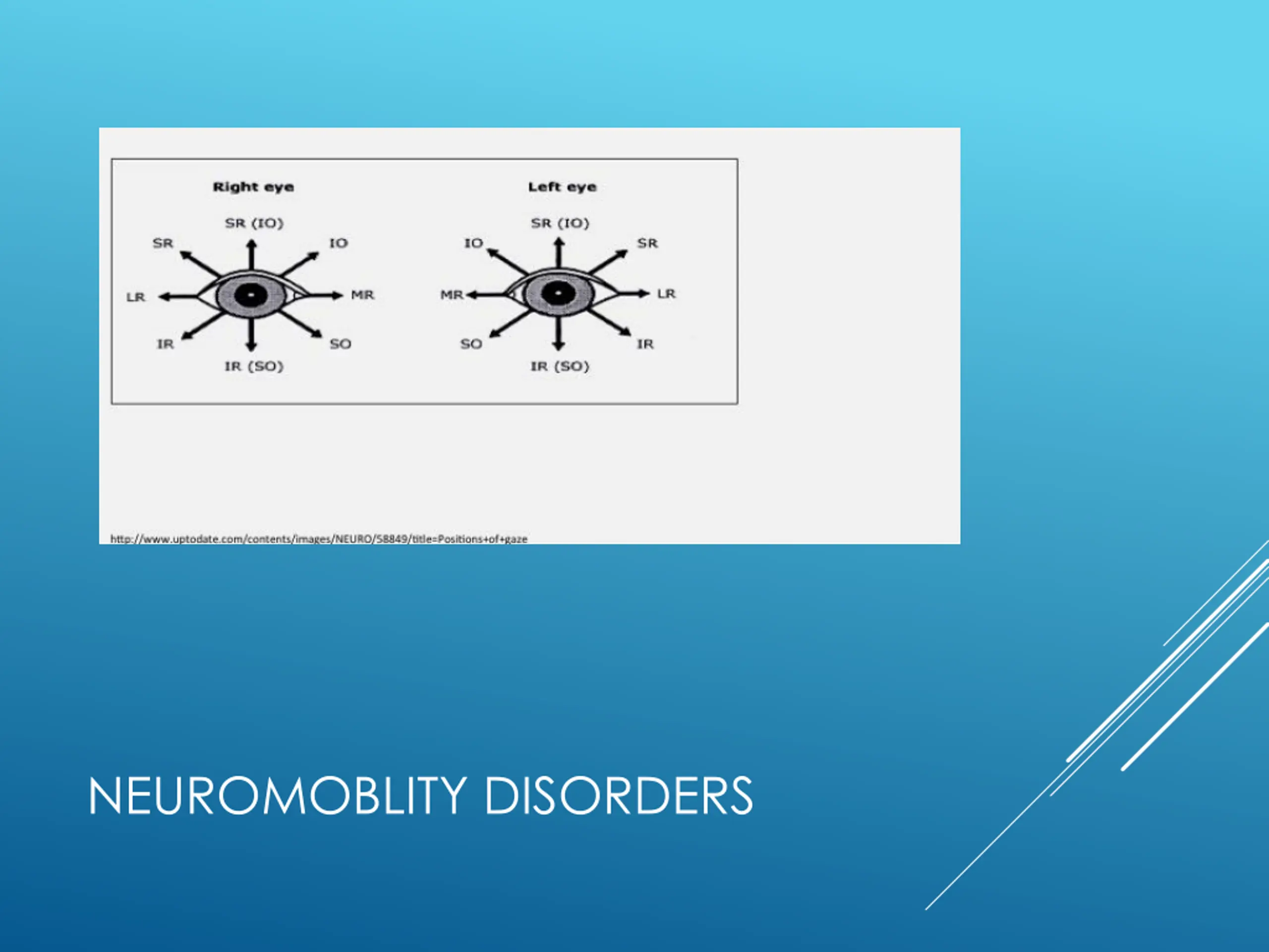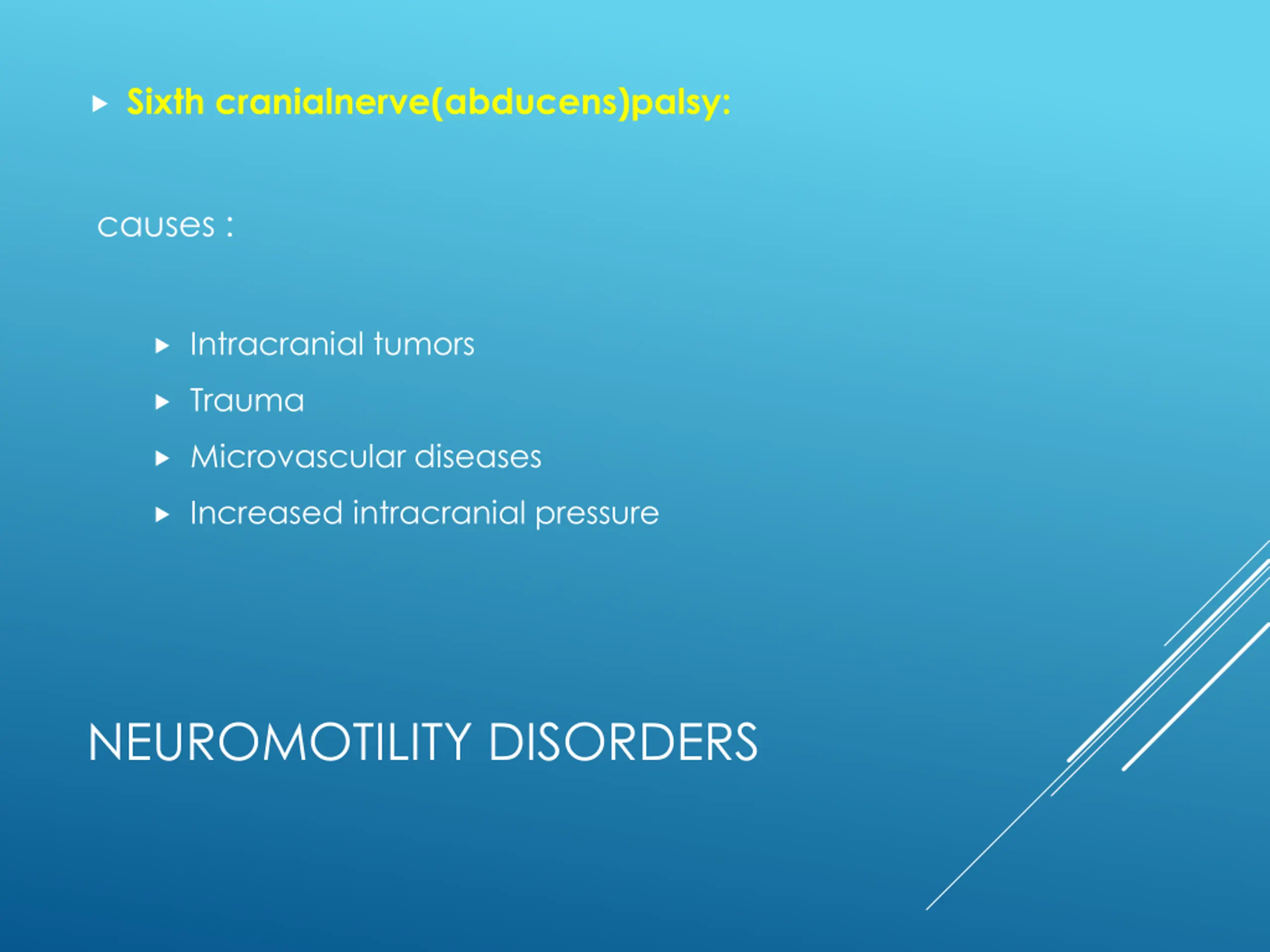 Sixth cranialnerve(abducens)palsy: causes : Intracranial tumors Trauma Microvascular diseases Increased intracranial pressure NEUROMOTILITY DISORDERS
