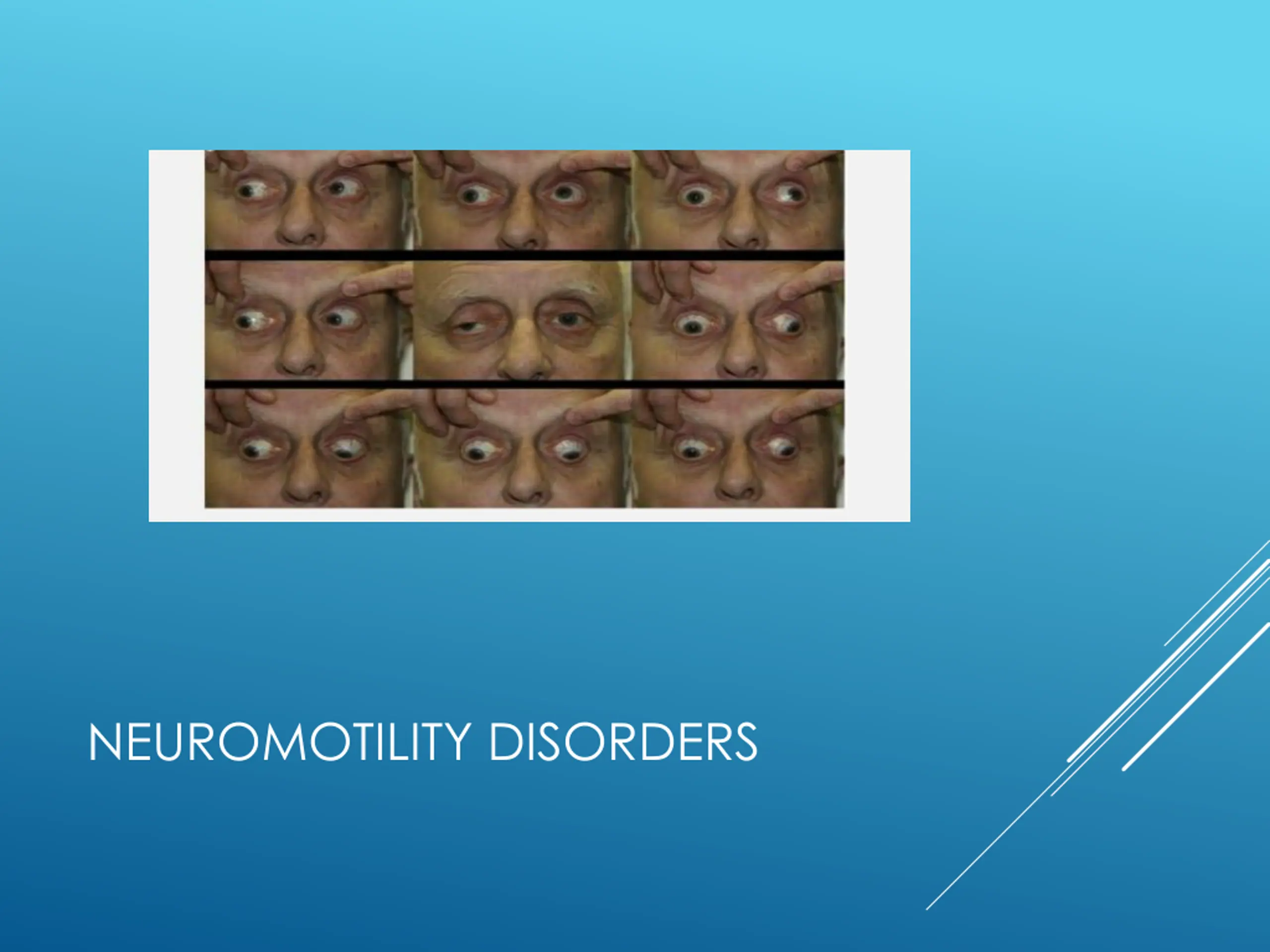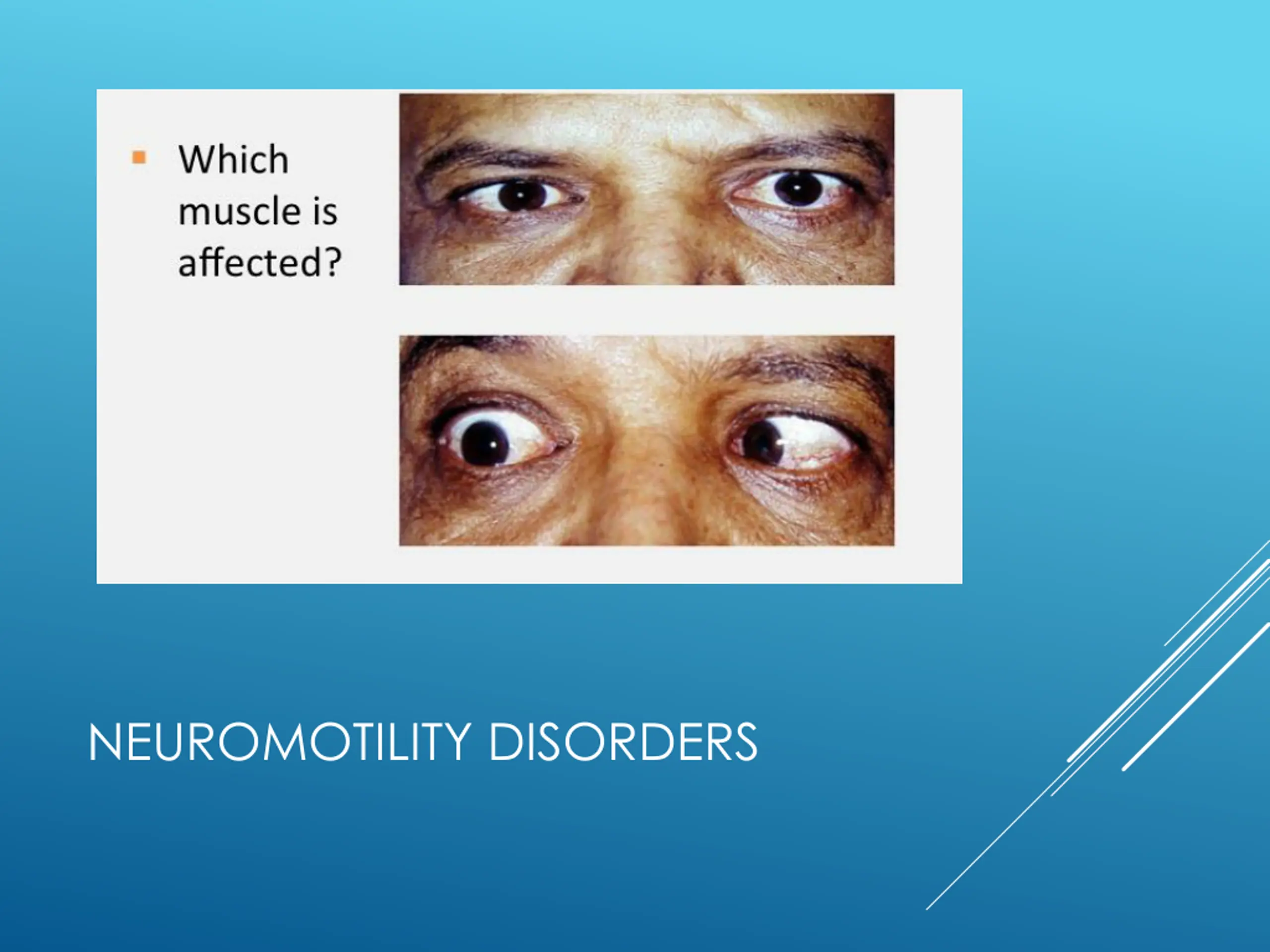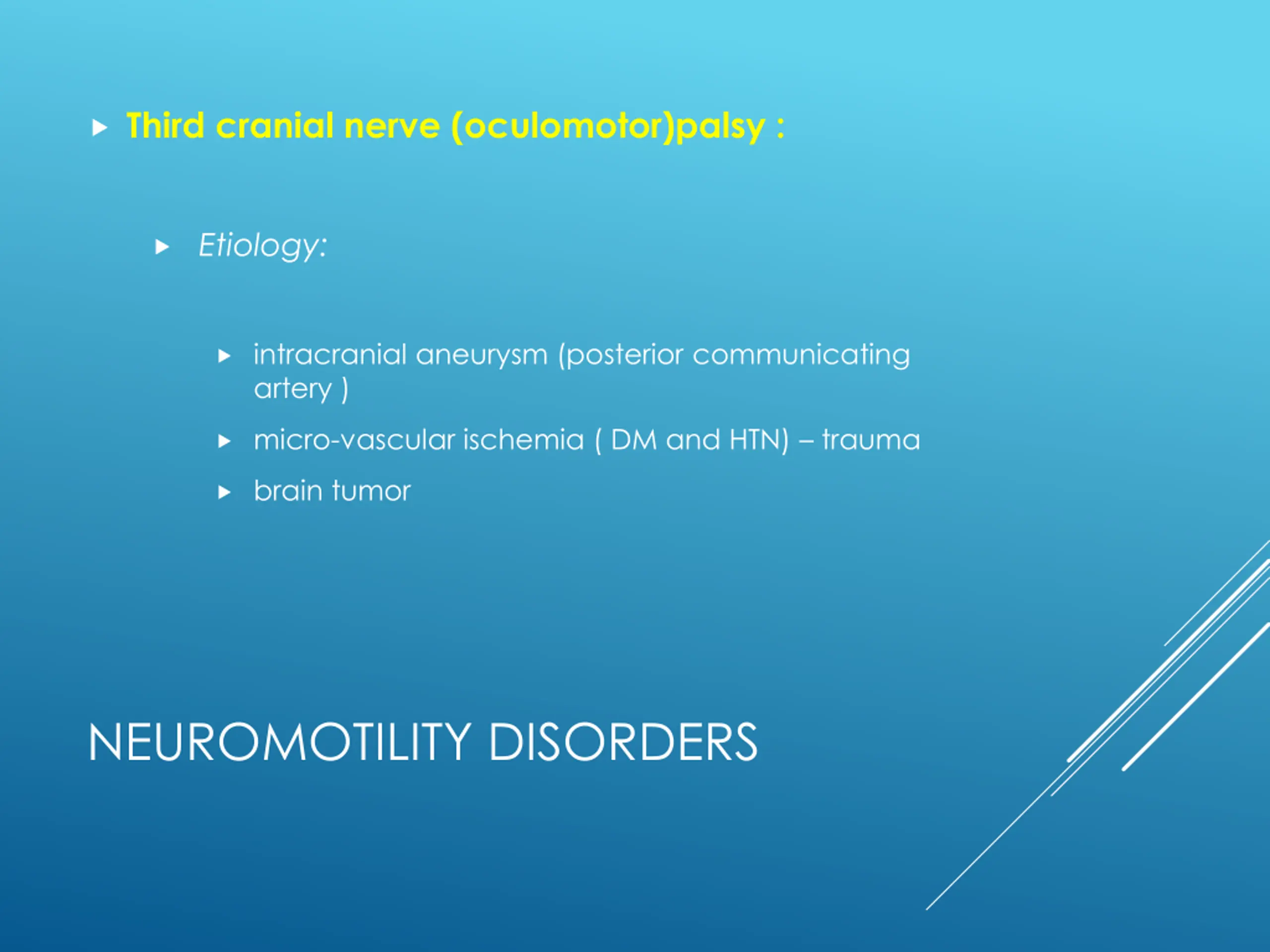 Third cranial nerve (oculomotor)palsy : Etiology: intracranial aneurysm (posterior communicating artery ) micro-vascular ischemia ( DM and HTN) trauma brain tumor NEUROMOTILITY DISORDERS