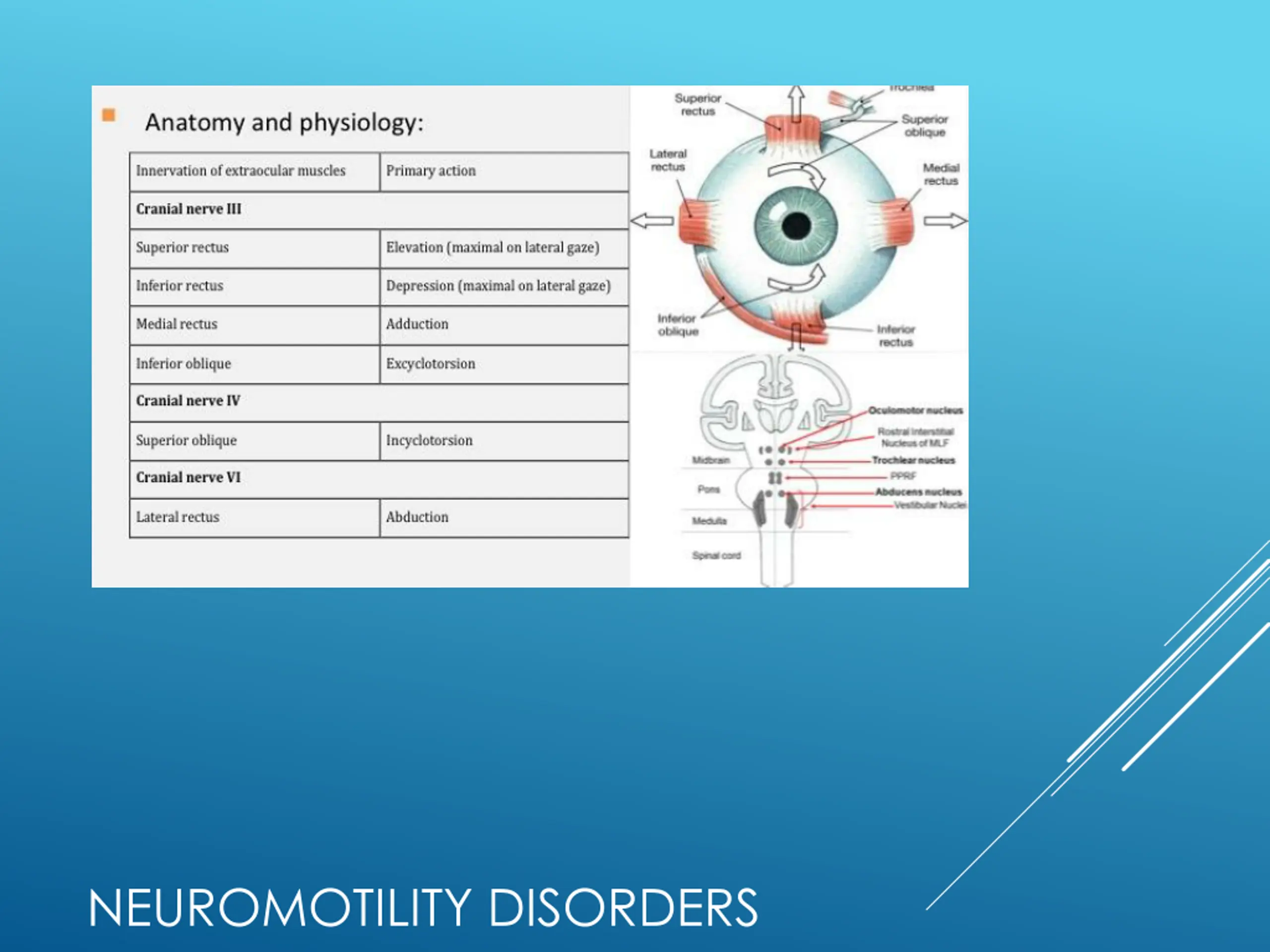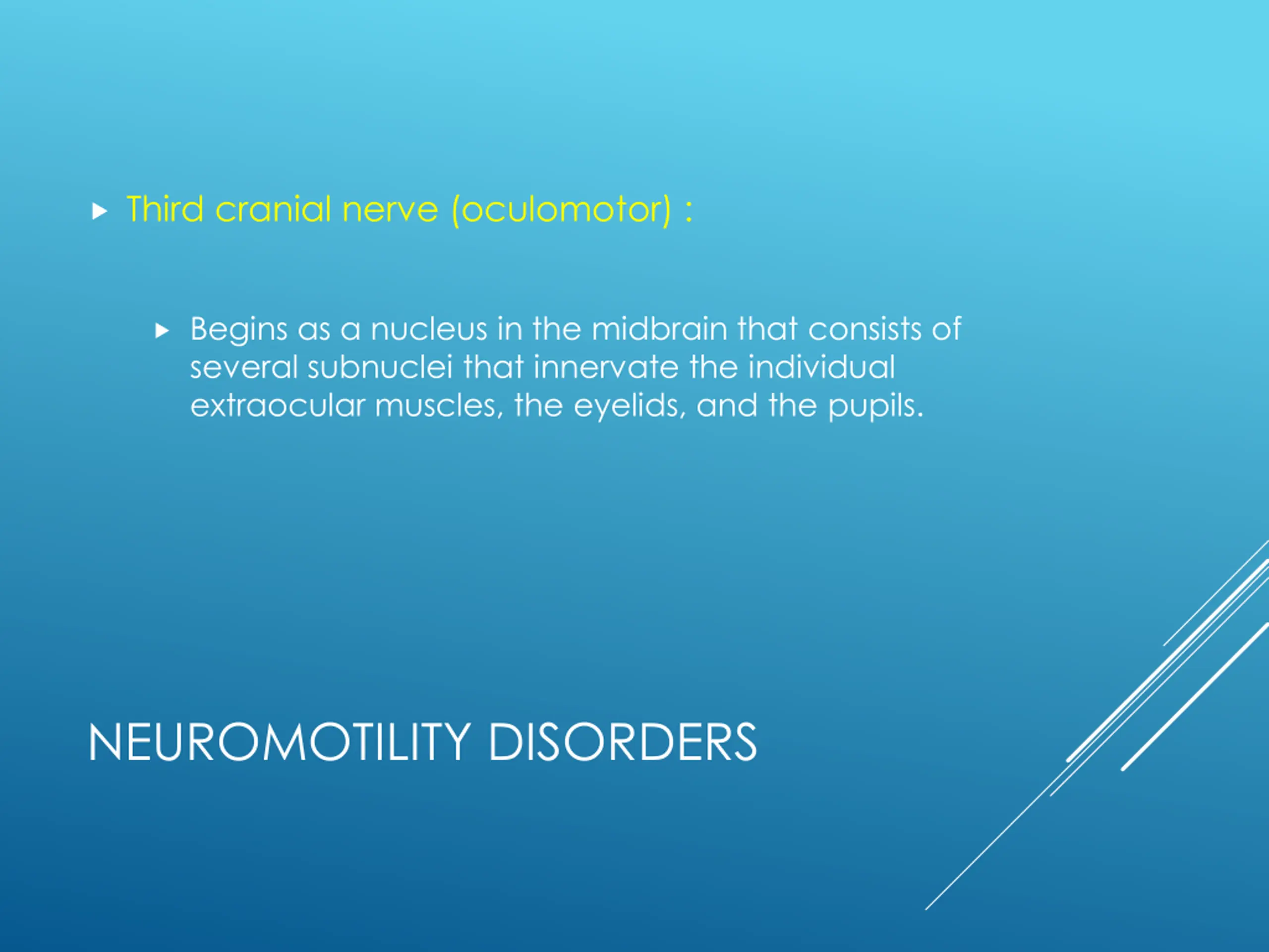 Third cranial nerve (oculomotor) : Begins as a nucleus in the midbrain that consists of several subnuclei that innervate the individual extraocular muscles, the eyelids, and the pupils. NEUROMOTILITY DISORDERS