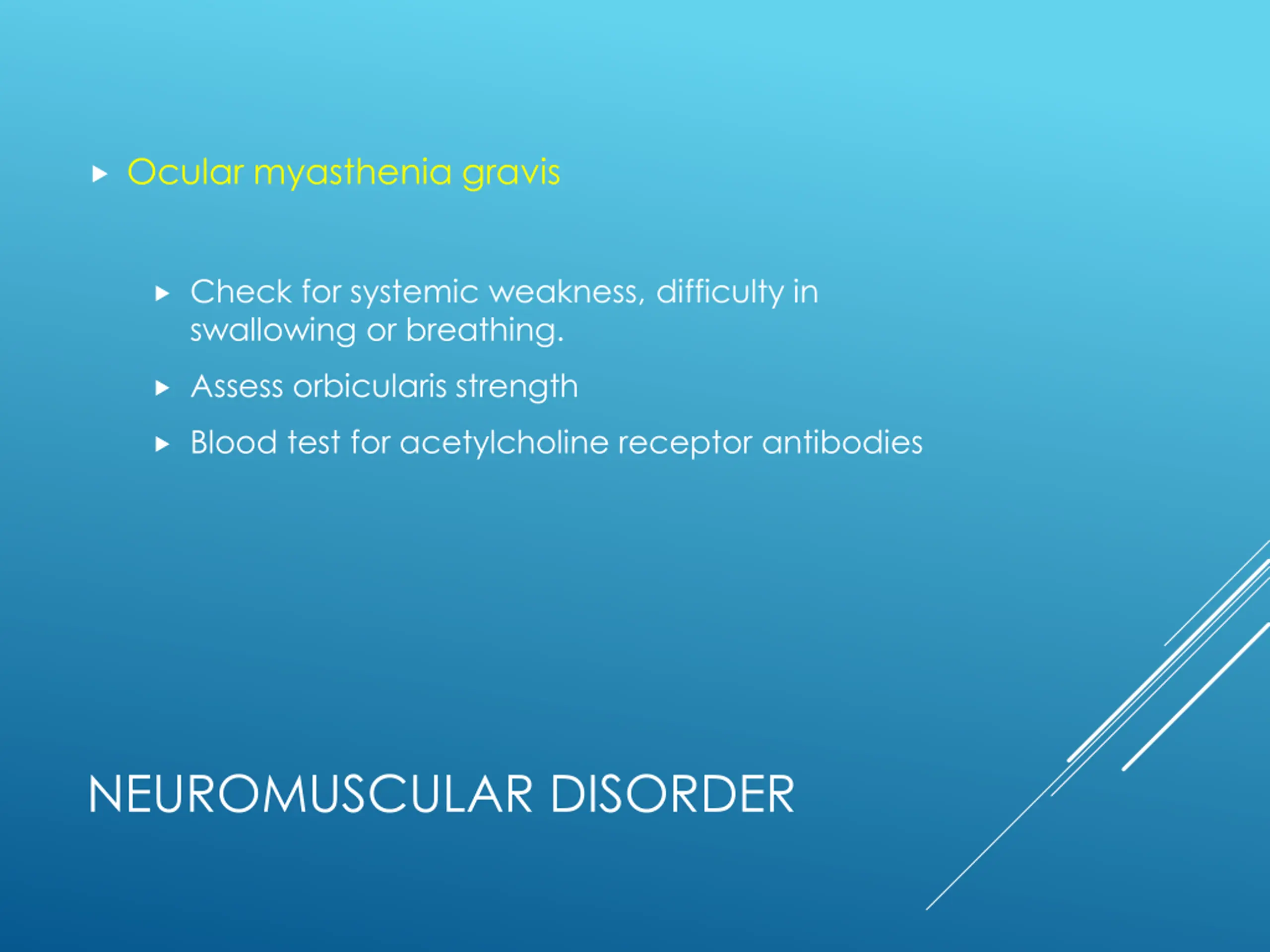 Ocular myasthenia gravis Check for systemic weakness, difficulty in swallowing or breathing. Assess orbicularis strength Blood test for acetylcholine receptor antibodies NEUROMUSCULAR DISORDER