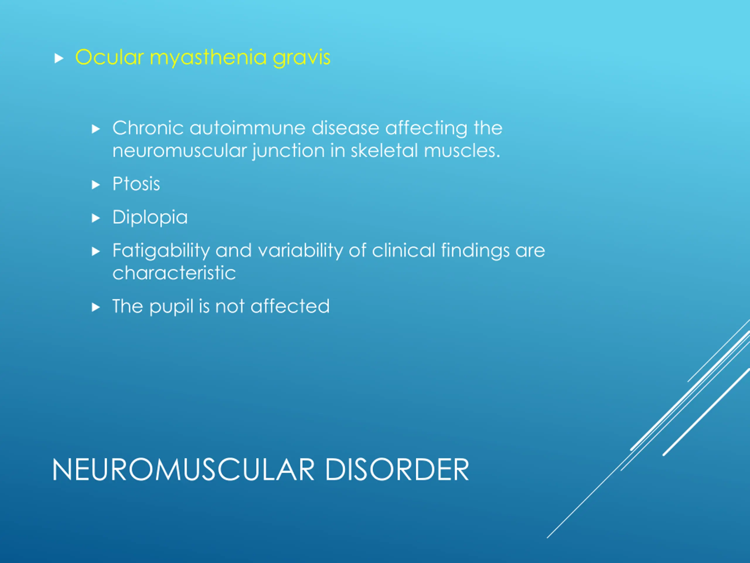 Ocular myasthenia gravis Chronic autoimmune disease affecting the neuromuscular junction in skeletal muscles. Ptosis Diplopia Fatigability and variability of clinical findings are characteristic The pupil is not affected NEUROMUSCULAR DISORDER