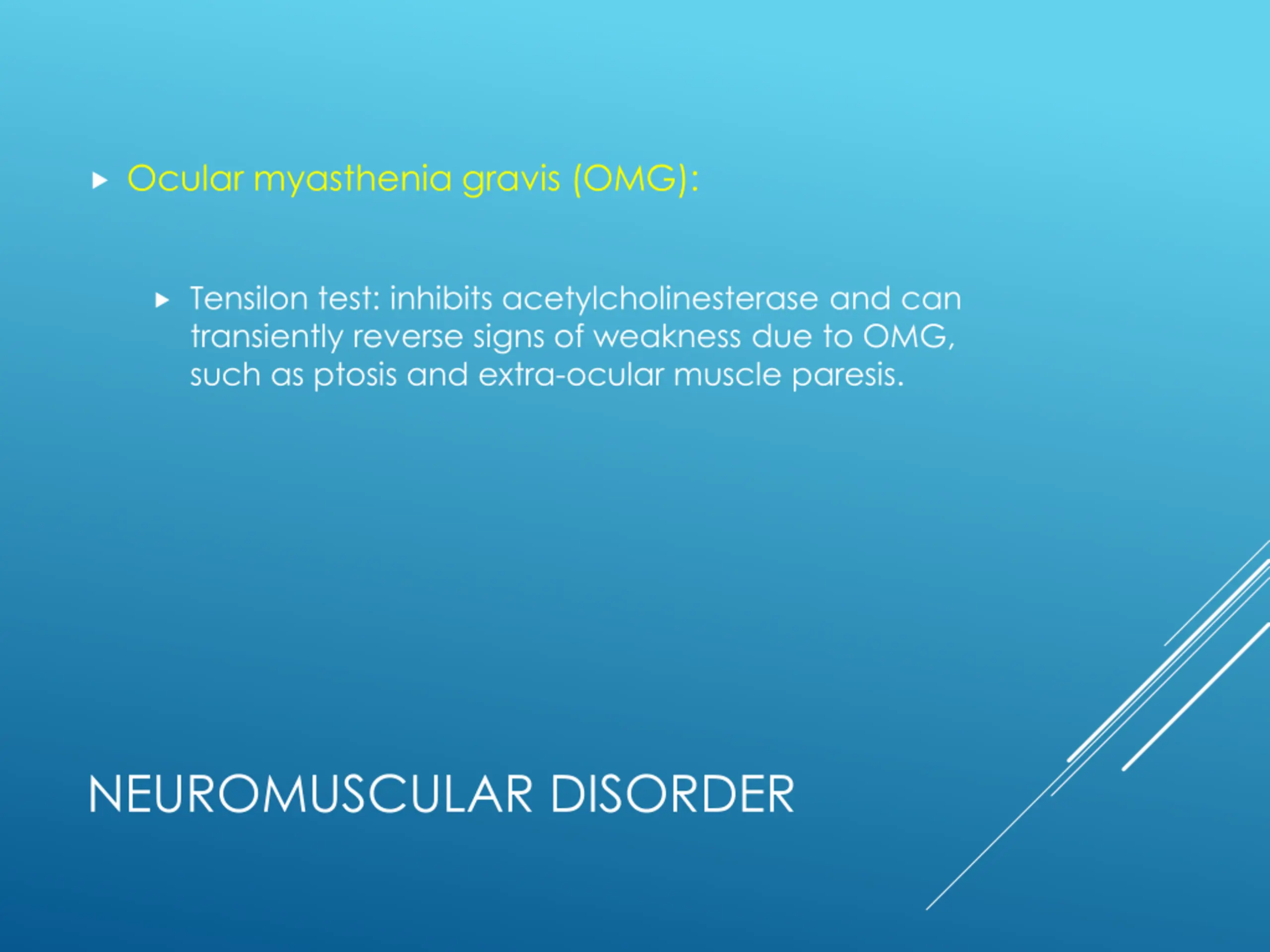 Ocular myasthenia gravis (OMG): Tensilon test: inhibits acetylcholinesterase and can transiently reverse signs of weakness due to OMG, such as ptosis and extra-ocular muscle paresis. NEUROMUSCULAR DISORDER